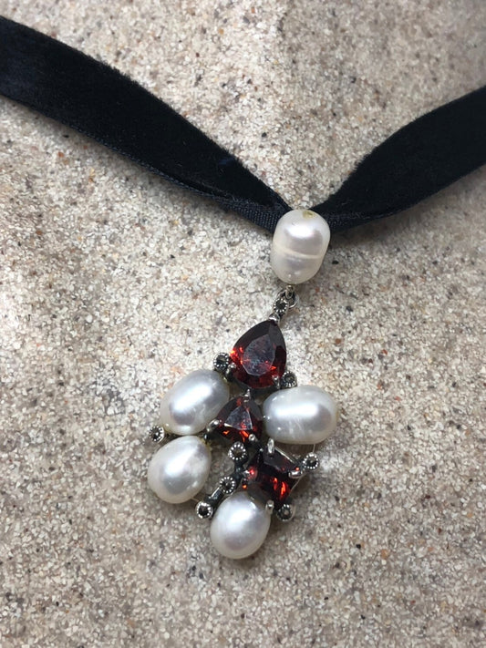 Vintage Handmade 925 Sterling Silver Genuine Pearl Garnet CZ Antique Pendant Necklace