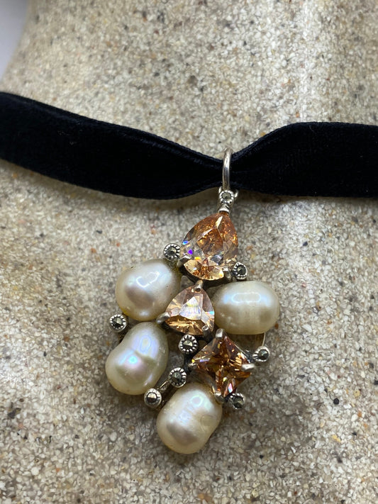 Vintage Handmade 925 Sterling Silver Genuine Pearl Golden CZ Antique Pendant Necklace Velvet Choker