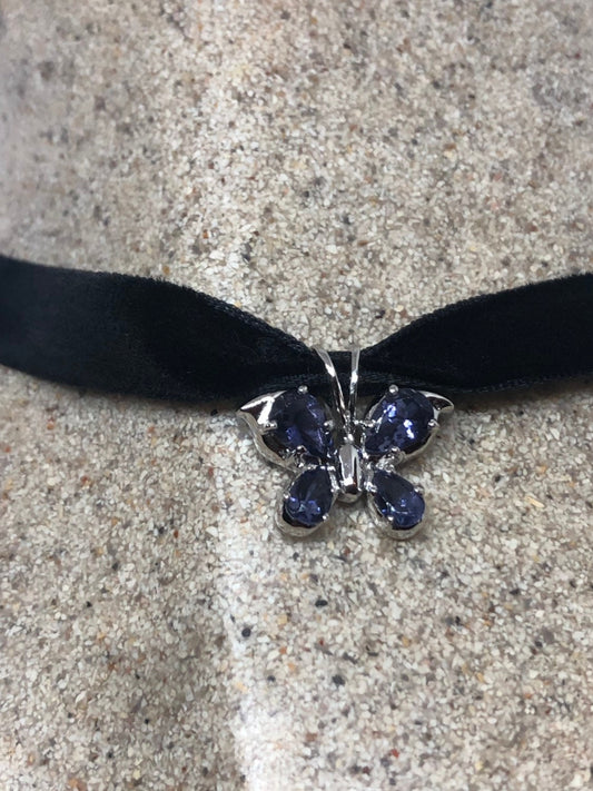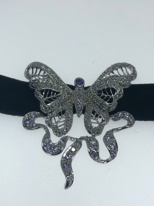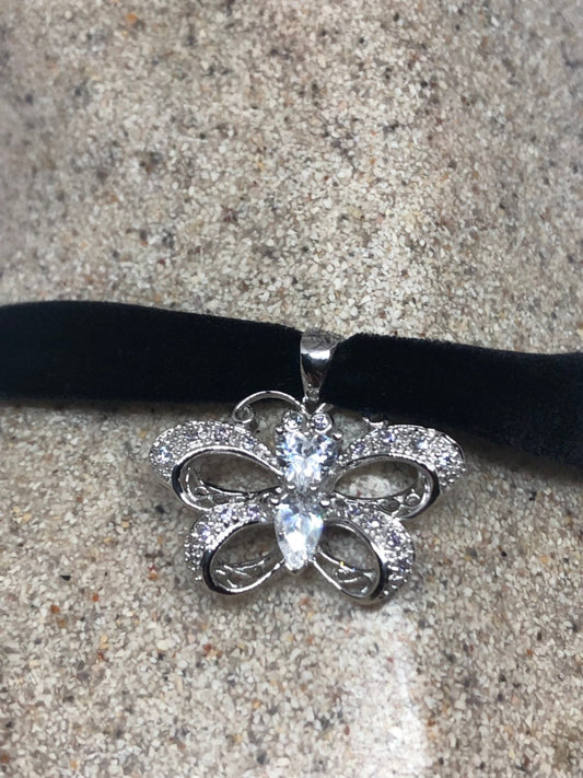 Vintage Handmade 925 Sterling Silver Rhodium White Sapphire Butterfly Pendant Choker