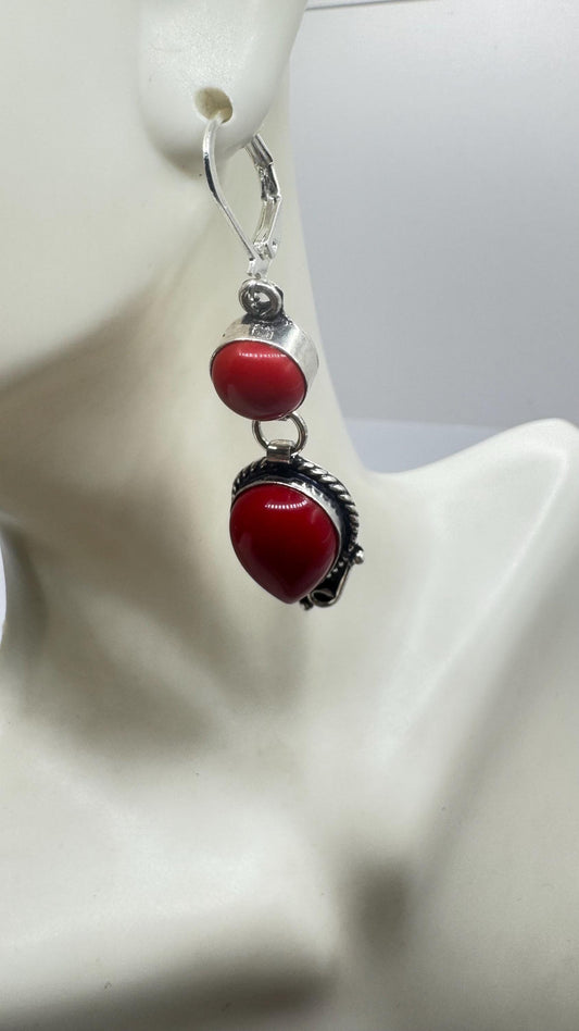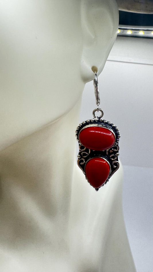 Vintage Red Coral Earrings 925 Sterling Silver Leverback