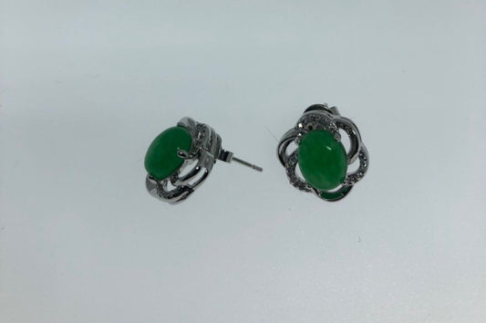 Vintage Fun Green Jade Gemstone Silver Bronze Stud Earrings