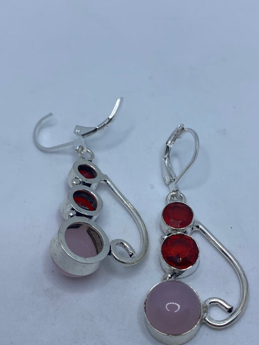 Vintage Red Ruby Glass Rose Quartz Earrings 925 Sterling Silver Leverback