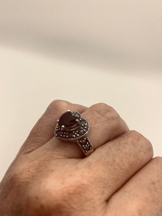 Vintage Heart Red Bohemian Garnet marcasite Ring 925 Sterling Silver Size 7