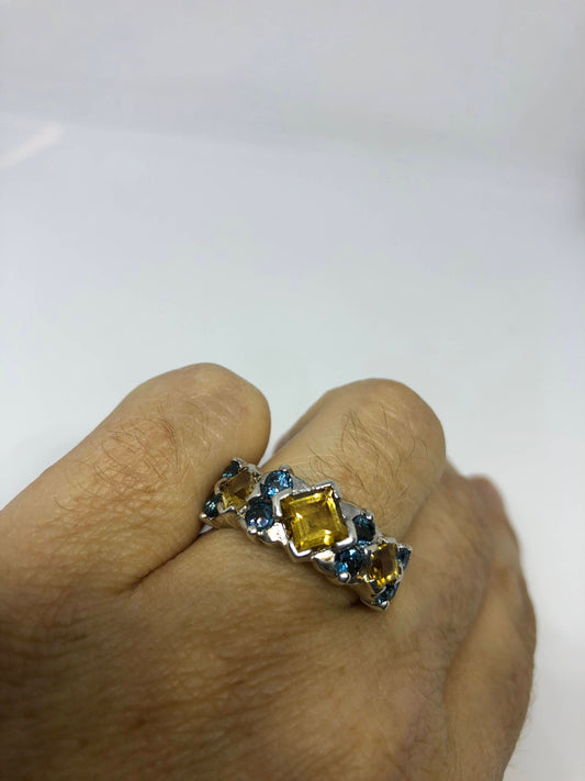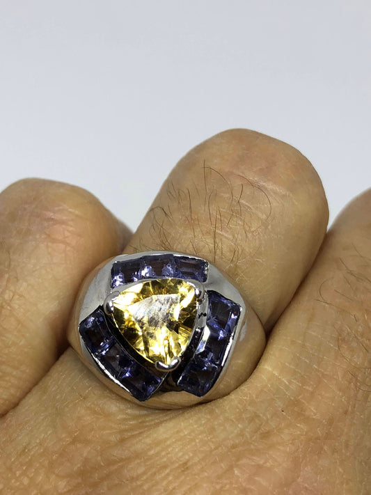 Vintage Gothic Golden Citrine and Blue Tanzanite 925 Sterling Silver Ring