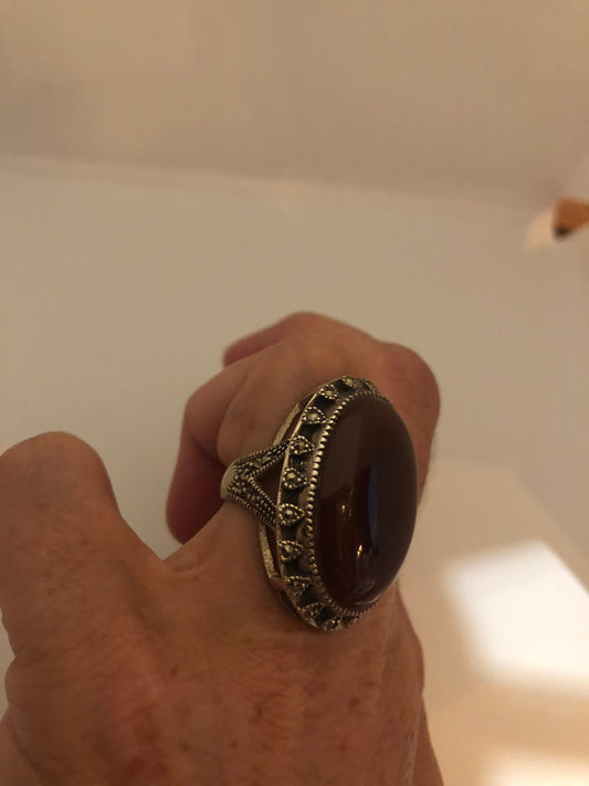 Vintage Genuine Red Carnelian 925 Sterling Silver Marcasite Ring