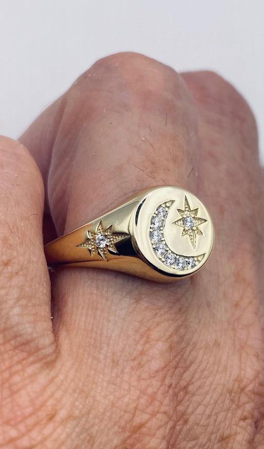 Vintage Muslim Star Crescent Moon Band Golden 925 Sterling Silver Ring