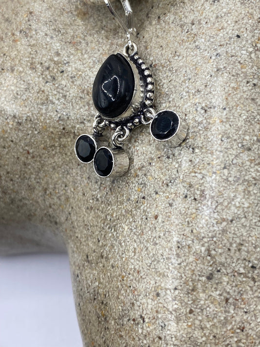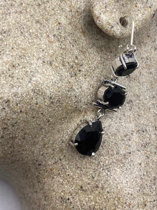 Antique Vintage Black Onyx Silver Dangle Earrings