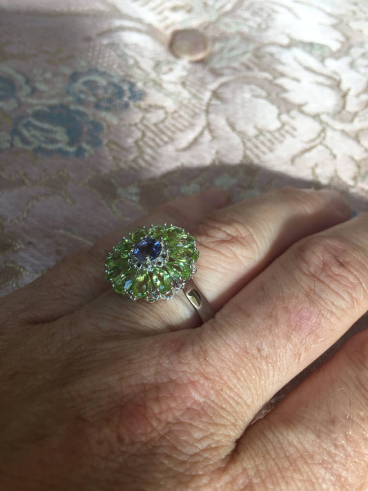 Vintage Green Peridot and Blue Iolite Flower 925 Sterling Silver Cocktail Ring
