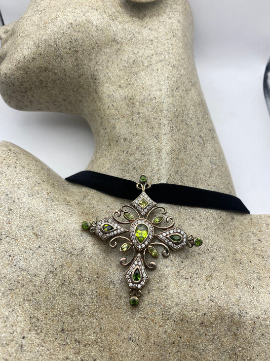 Vintage Green Peridot Chrome Diopside Choker 925 Sterling Silver Cross Pendant