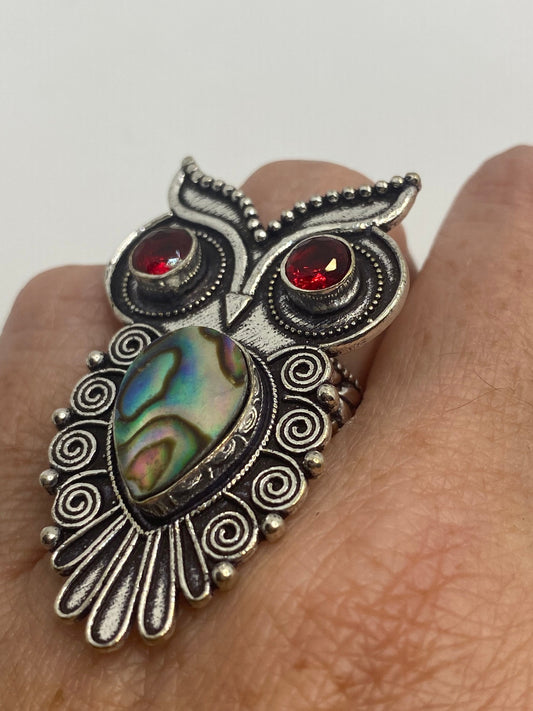 Antique Green Abalone White Bronze Silver owl Ring