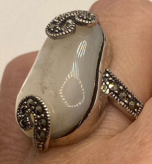 Marcasite Mother of Pearl Cocktail Ring in 925 Sterling Silver Size 7 Vintage Handmade