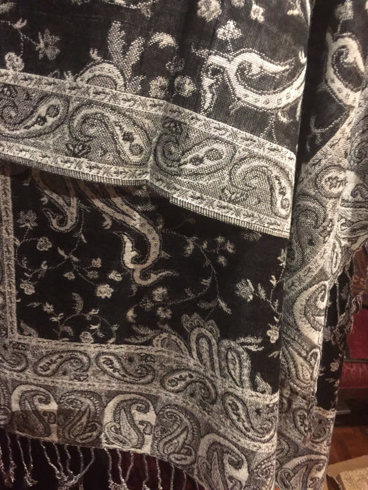 Nemesis Vintage Black and White Paisley Pashmina Scarf Wrap