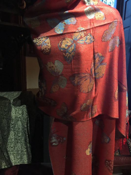 Nemesis Vintage Burgundy Gold Butterfly Brocade Pashmina Scarf Wrap