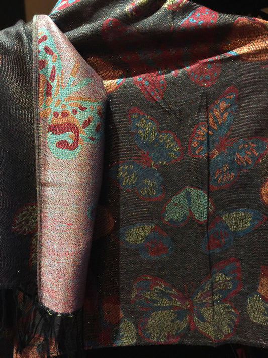Nemesis Vintage Black Gold Butterfly Brocade Pashmina Scarf Wrap
