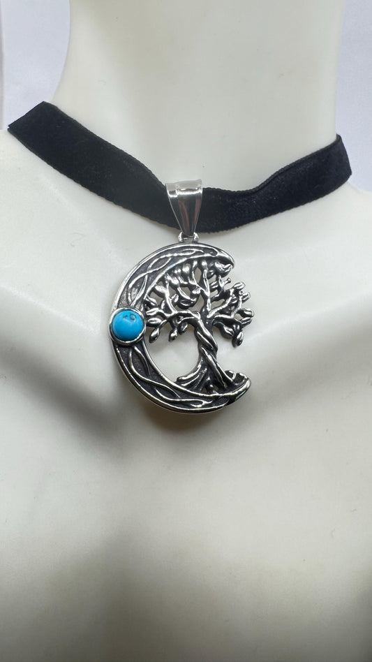 Vintage turquoise Silver Stainless Steel moon and tree of life Choker Necklace