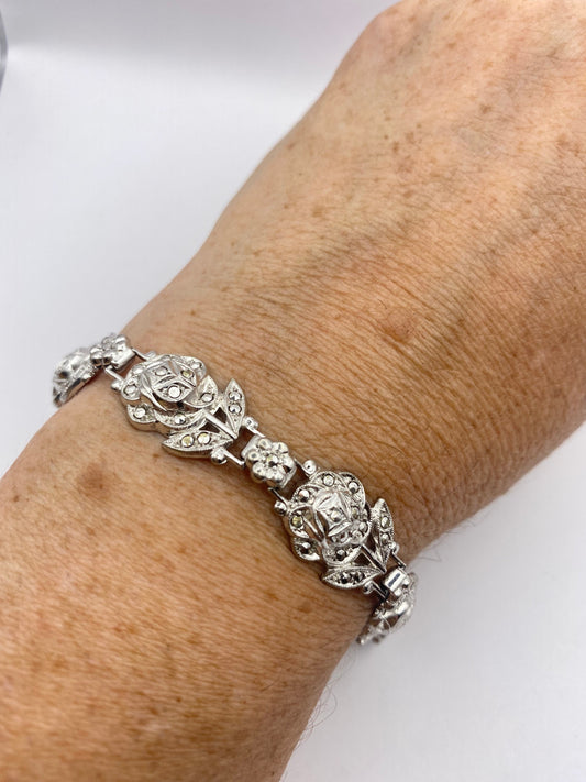 Marcasite Rose Bracelet in 925 Sterling Silver Vintage Handmade 7.5 Inch