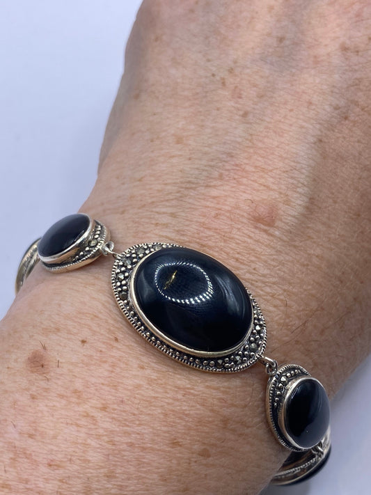 Vintage 925 Sterling Silver Marcasite Black Onyx Bracelet