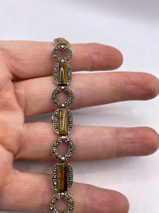 Vintage Tigers Eye 925 Sterling Silver Marcacite Filligree Bracelet