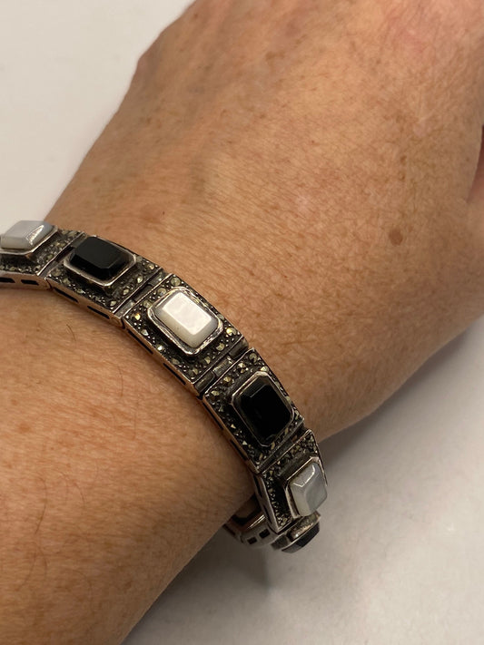 Vintage 925 Sterling Silver Marcacite Black Onyx Mother of Pearl Bracelet