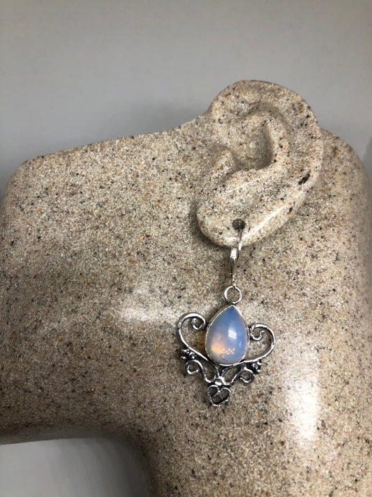 Vintage Silver Earrings | White Fire Opal Glass Crystal Antique Style Setting Dangle Drop Earrings