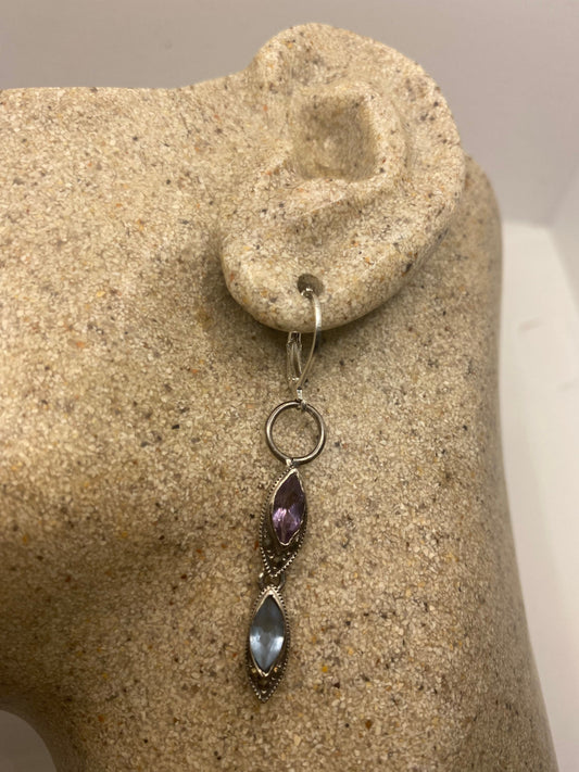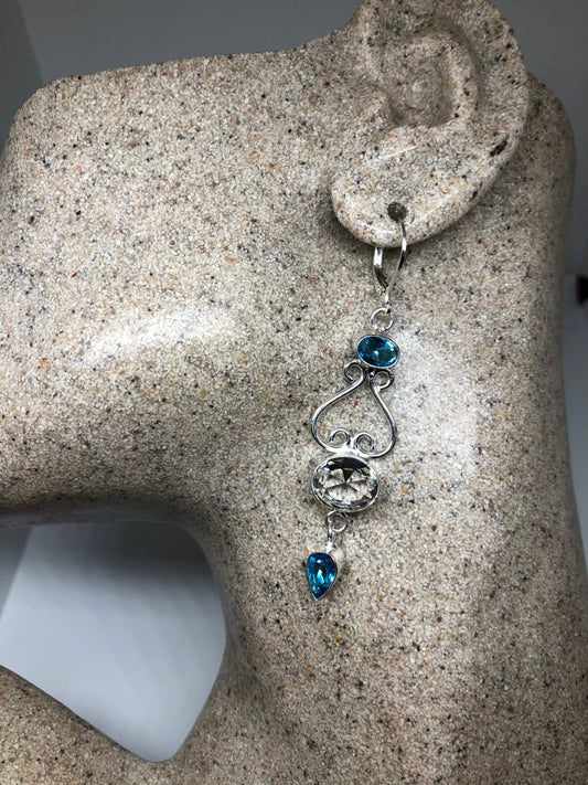 Vintage Silver Earrings | Blue and White Topaz Gemstone Antique Style Multistone Setting Silver Dangle Drop Chandelier Earrings