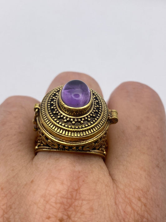 Vintage Purple Amethyst Brass Poison Pillbox Ring