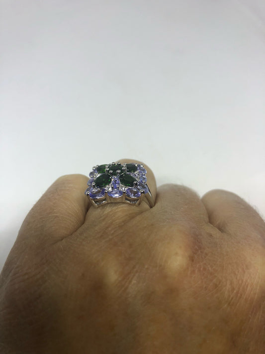 Vintage Handmade Green Chrome Diopside and Tanzanite Filigree Setting Sterling Silver Gothic Ring