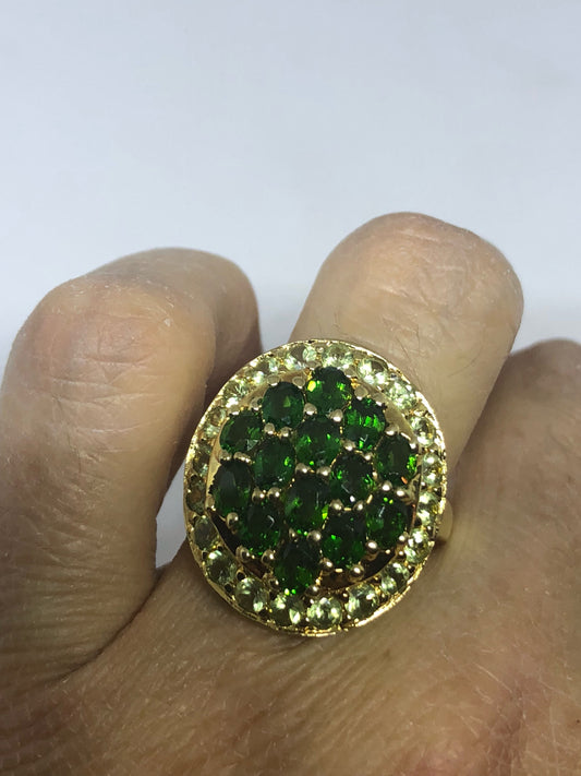 Vintage Handmade Green Chrome Diopside and Peridot Filigree Setting Gold Sterling Silver Gothic Ring
