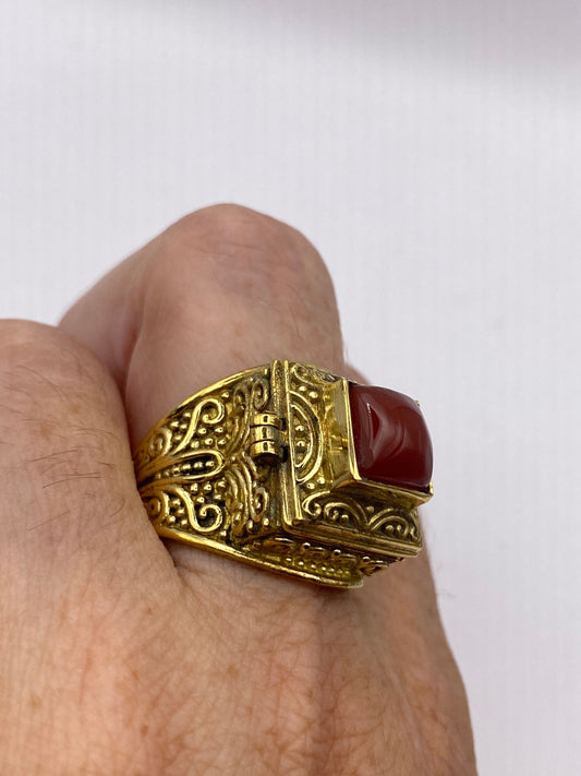 Vintage Red Carnelian Brass Poison Pillbox Ring