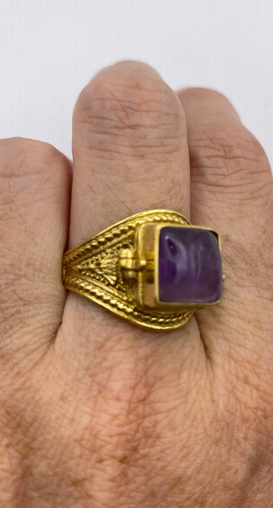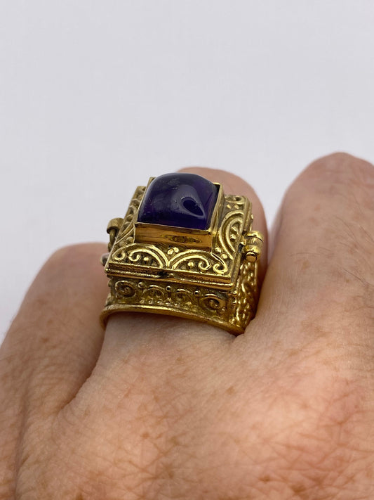 Vintage Purple Amethyst Brass Poison Pillbox Ring