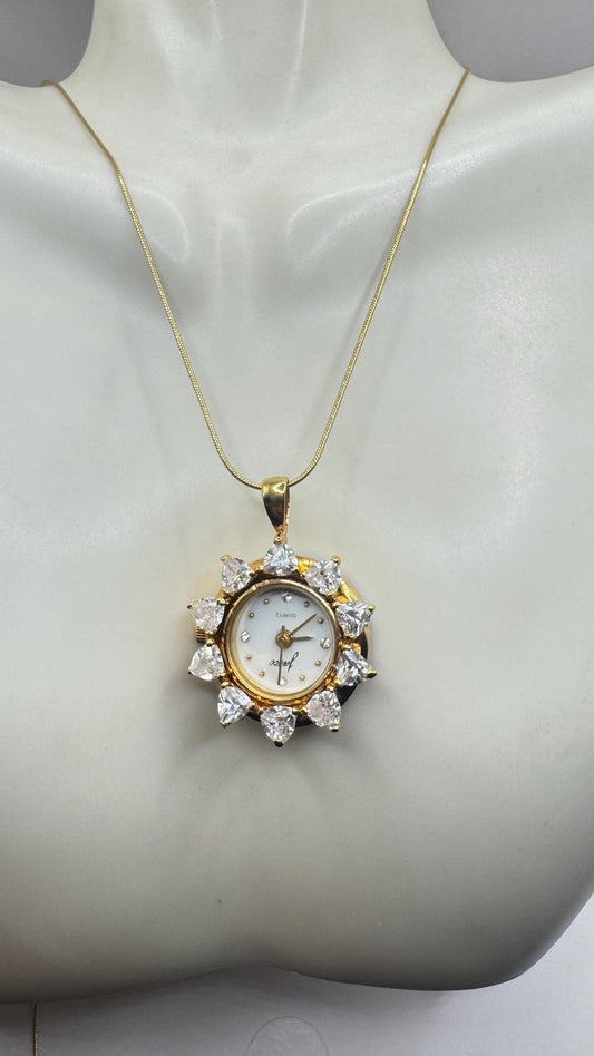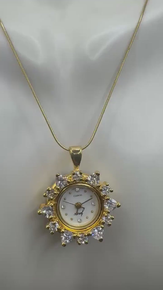 Vintage Watch Necklace Golden 925 Sterling Silver Clear CZ