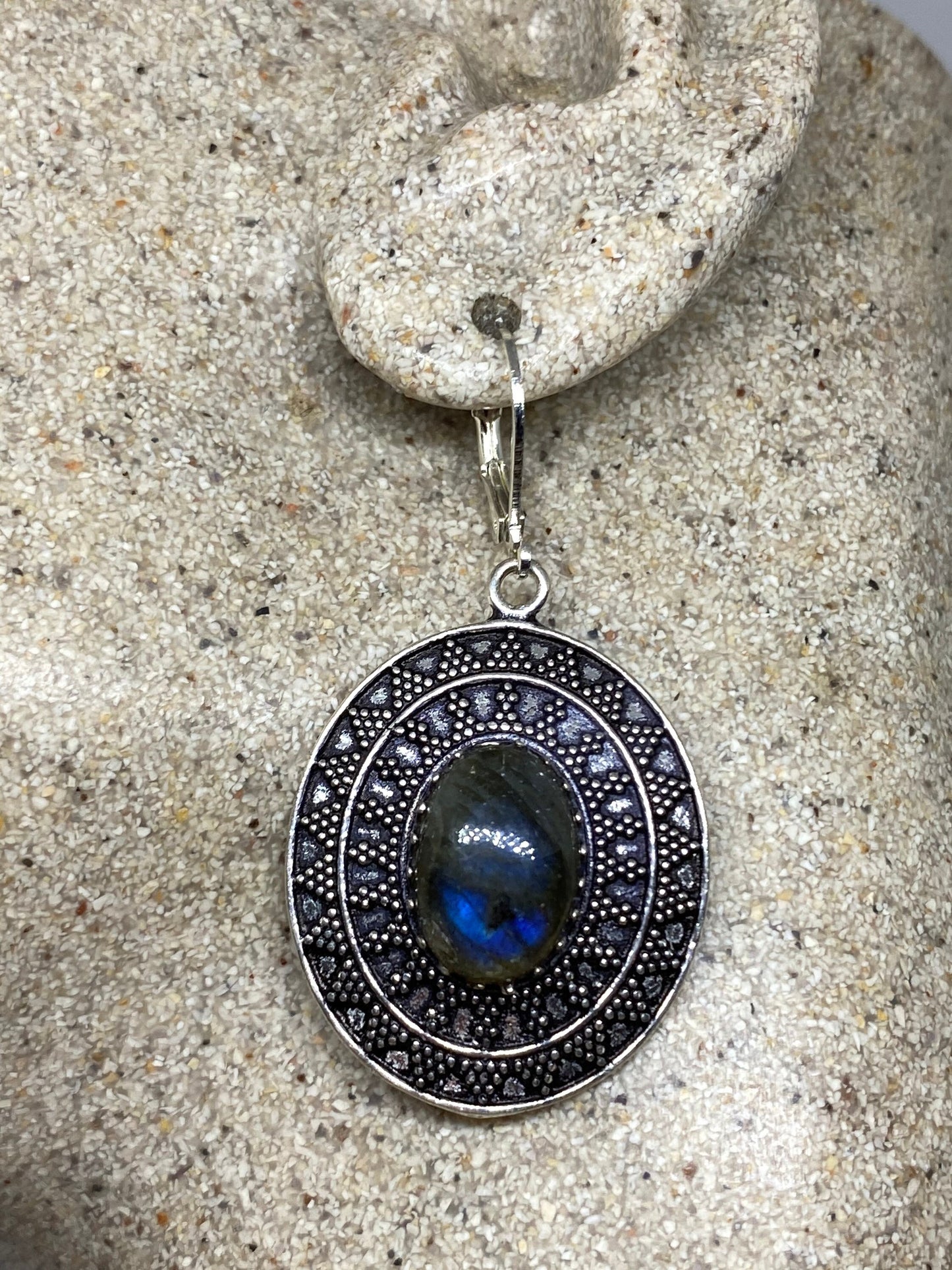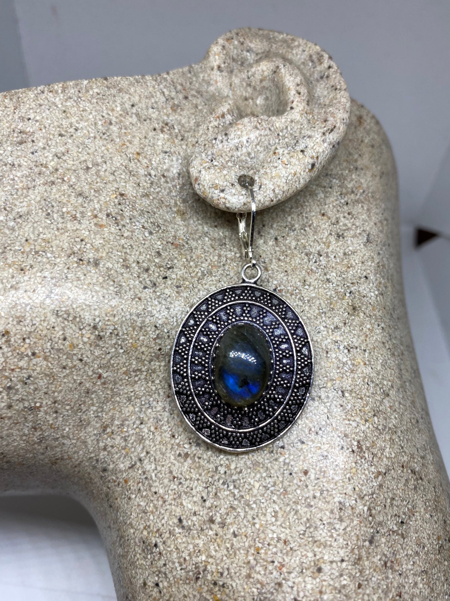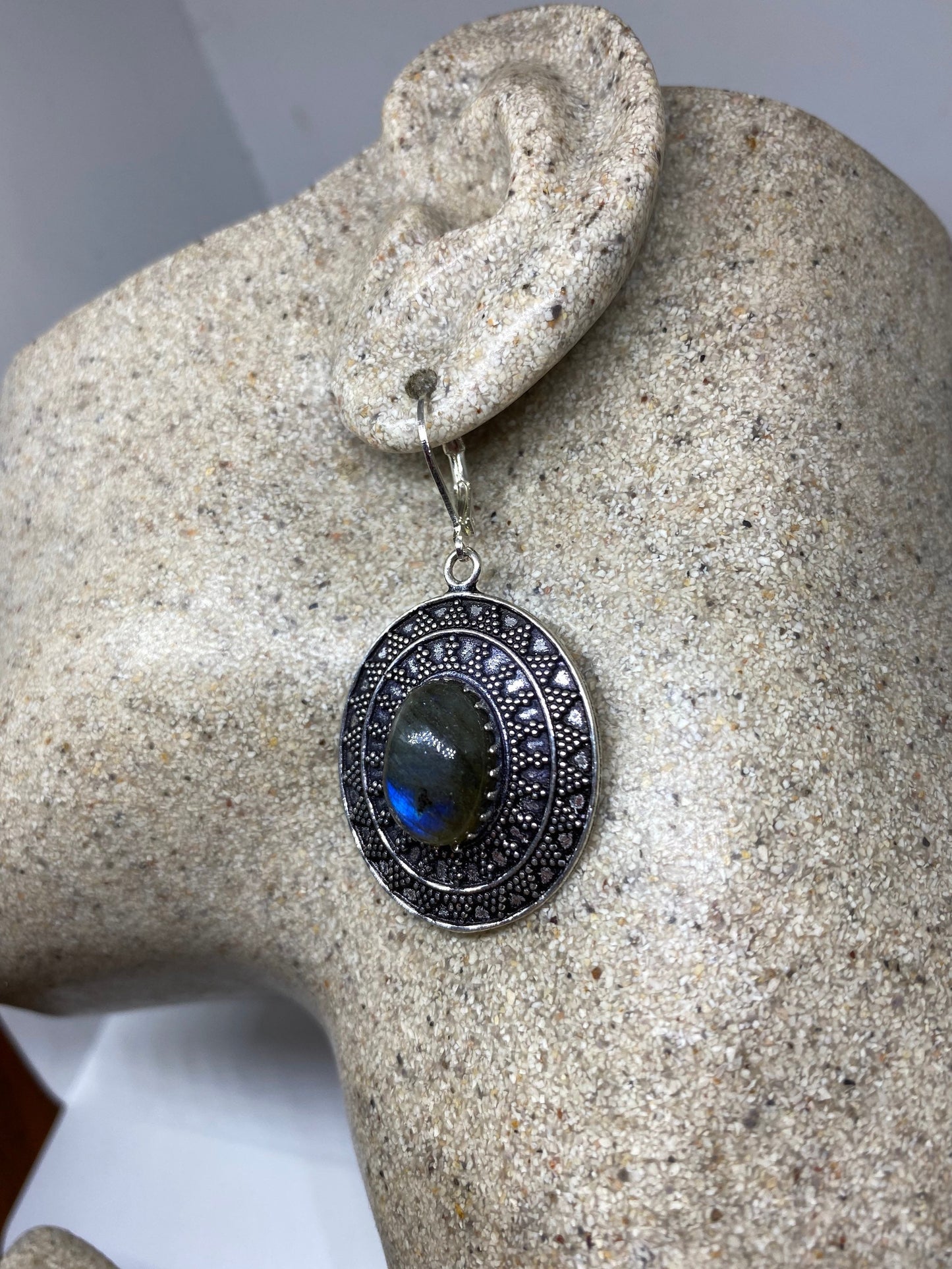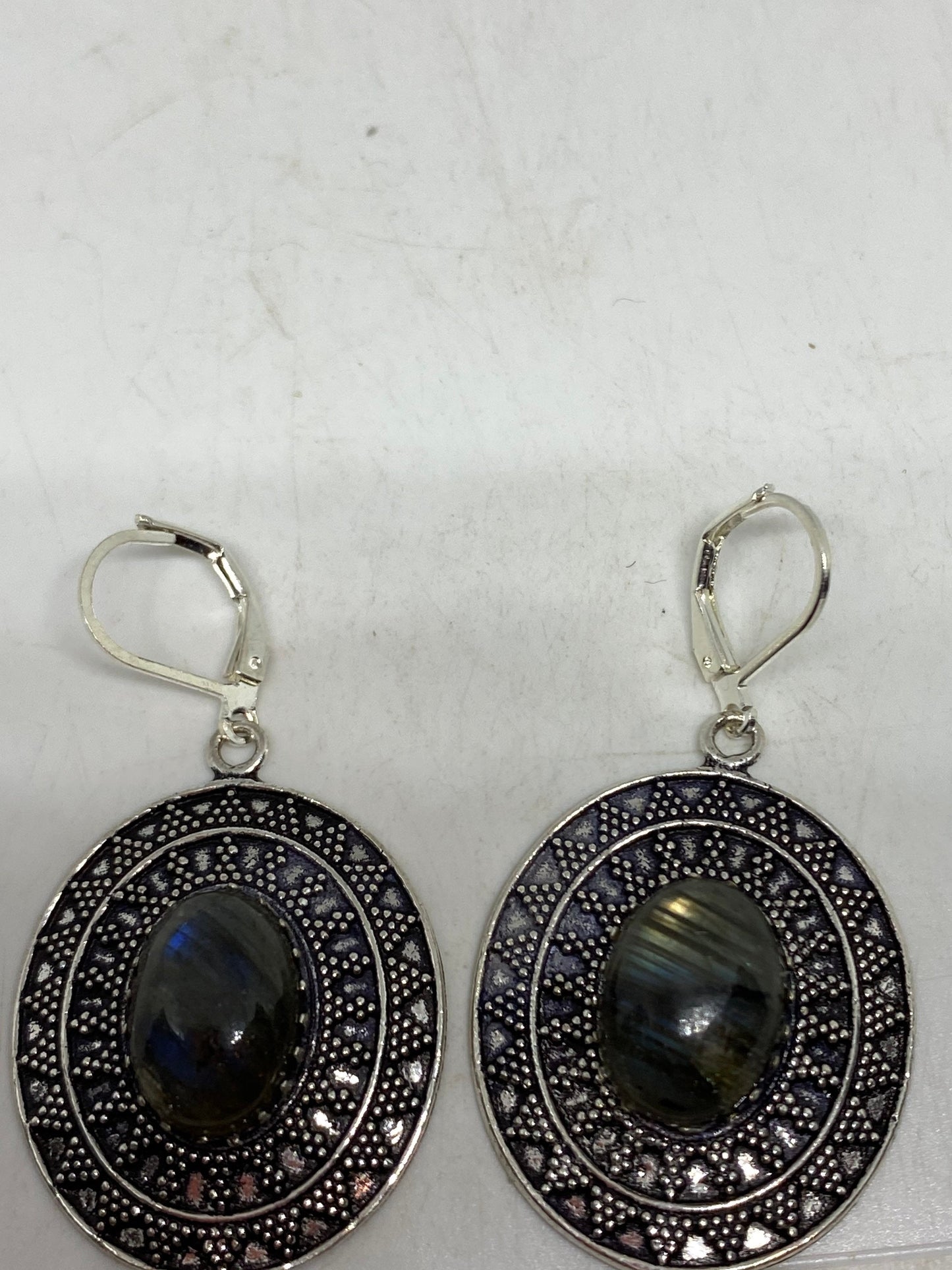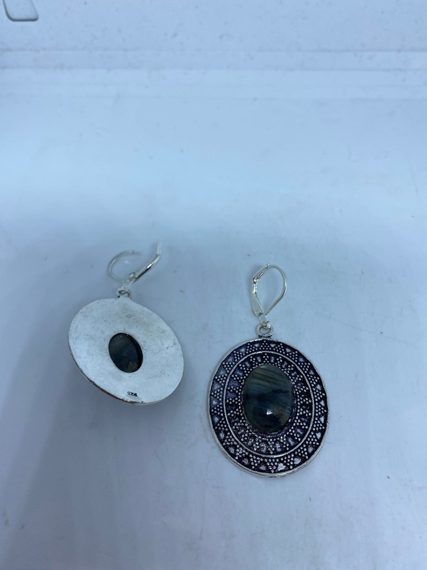 Antique Vintage Green Labradorite Silver Dangle Earrings