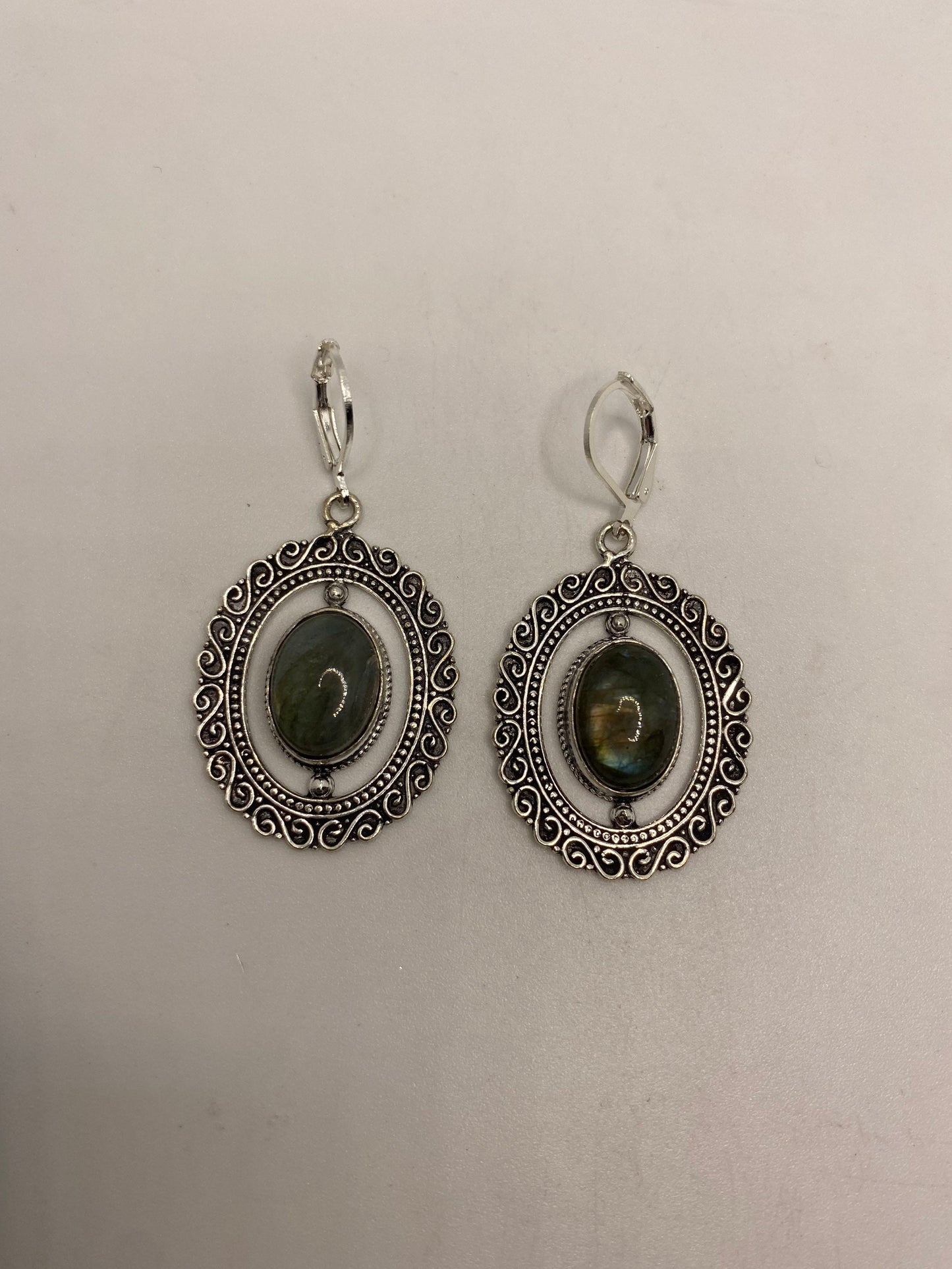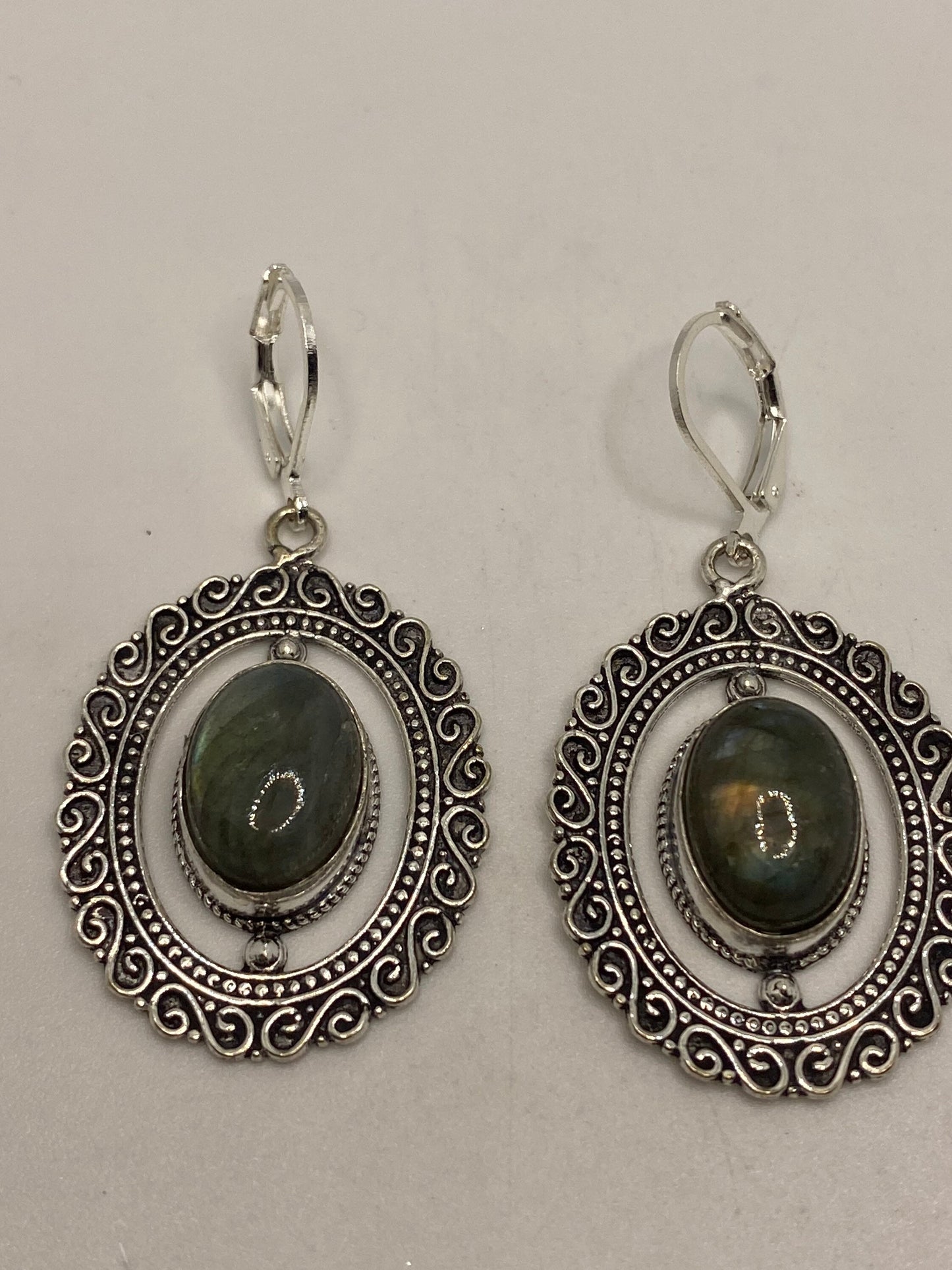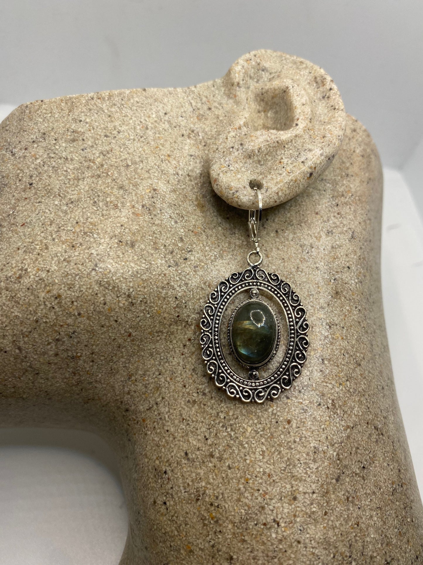 Antique Vintage Green Labradorite Silver Dangle Earrings