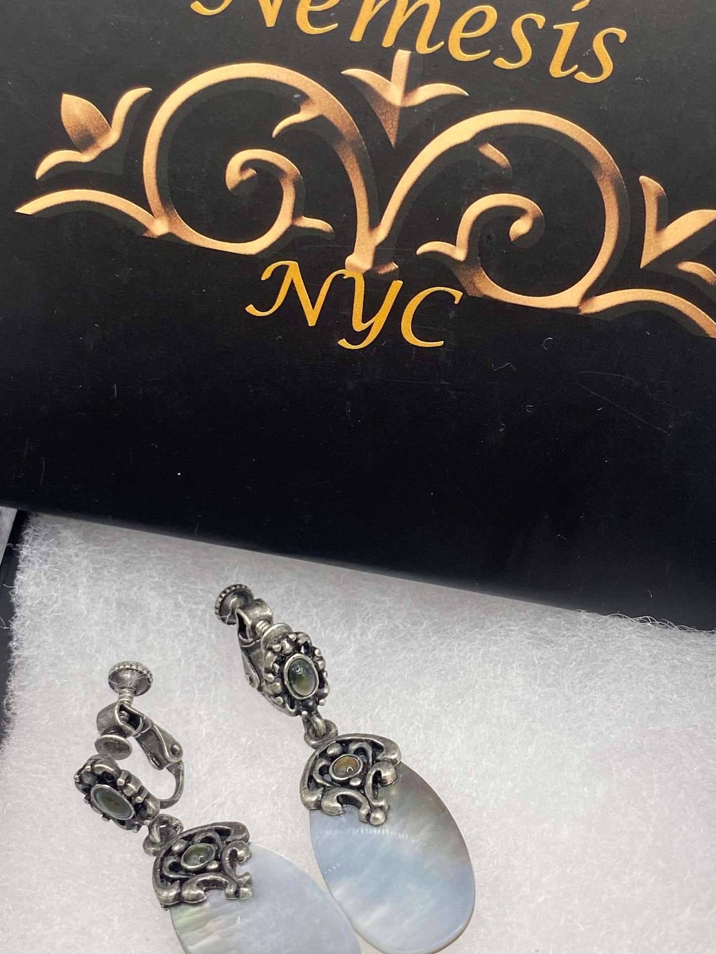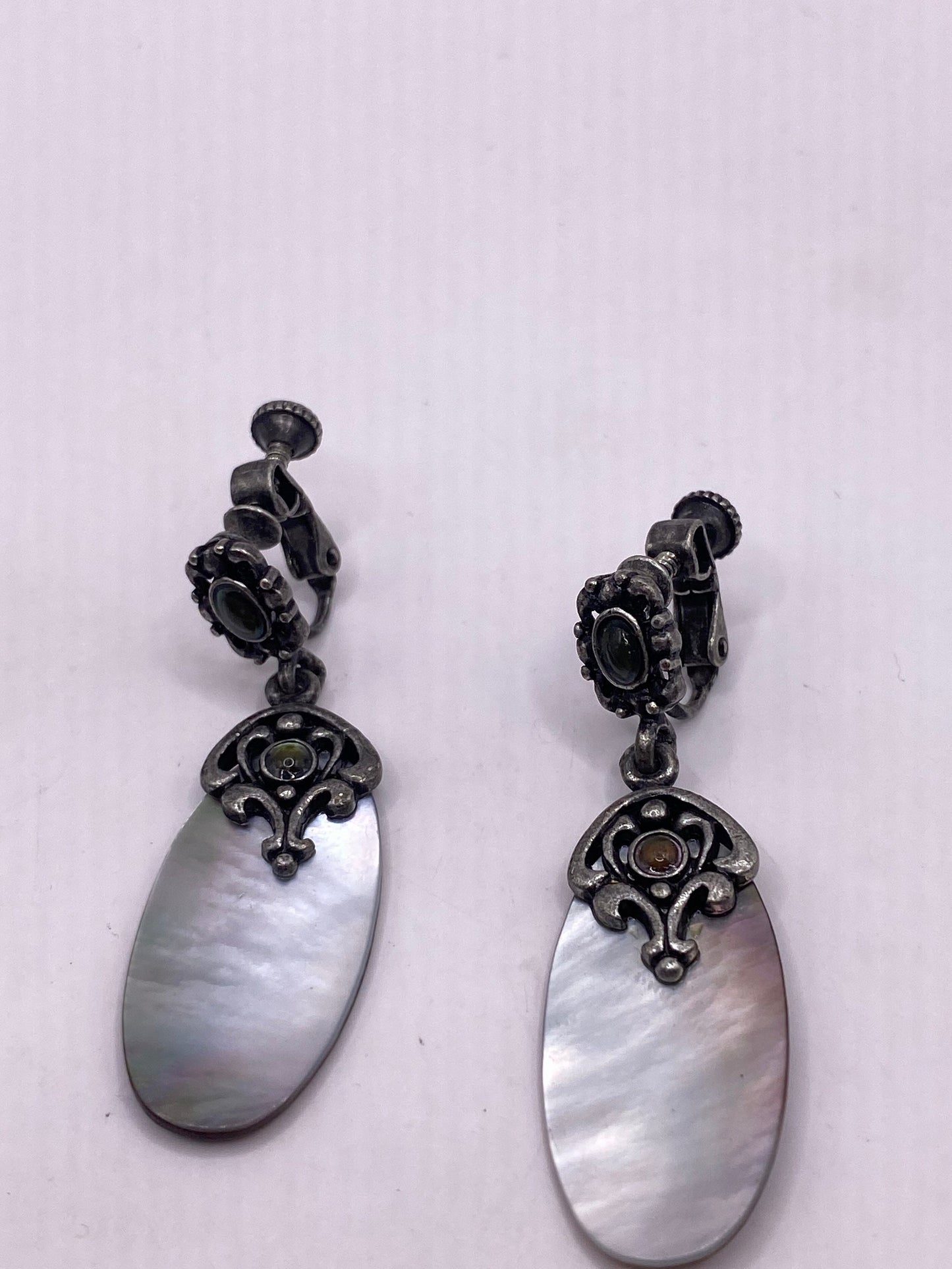 Antique Vintage Mother of pearl Silver Clip On button Earrings