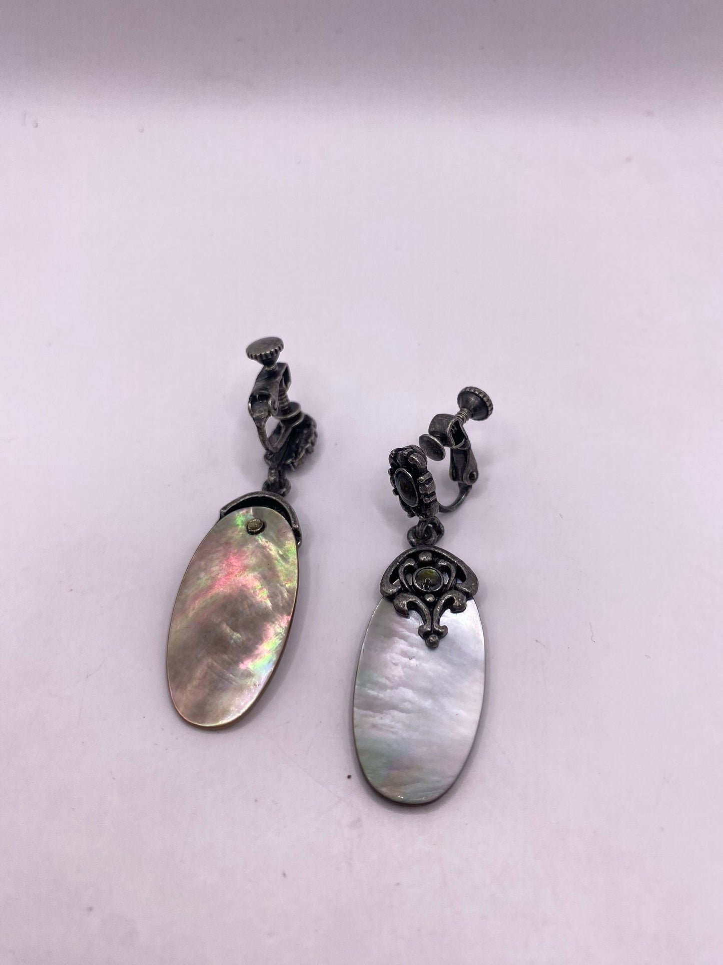 Antique vintage mother of pearl silver clip on button earrings
