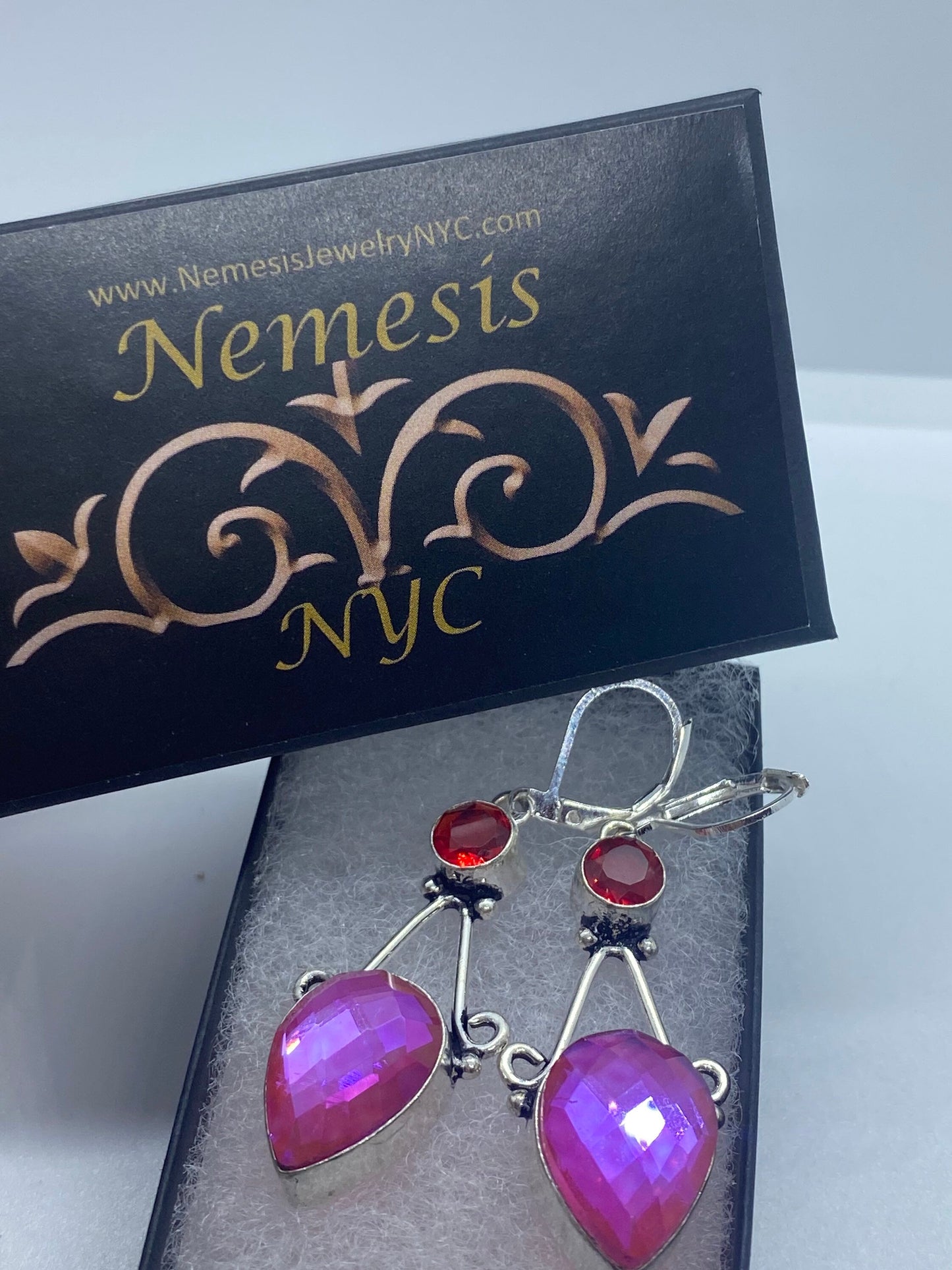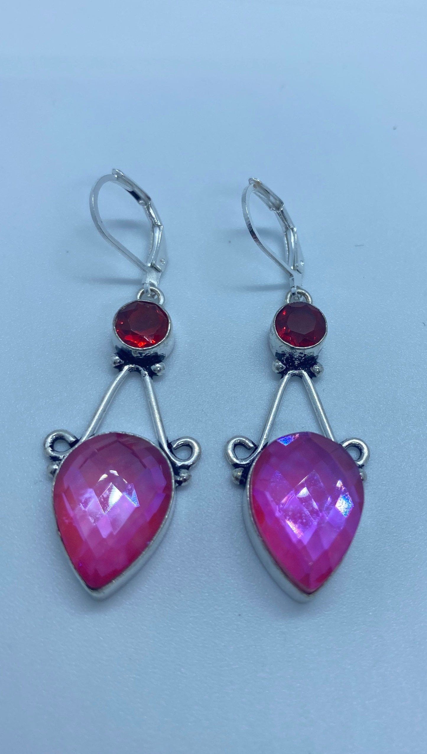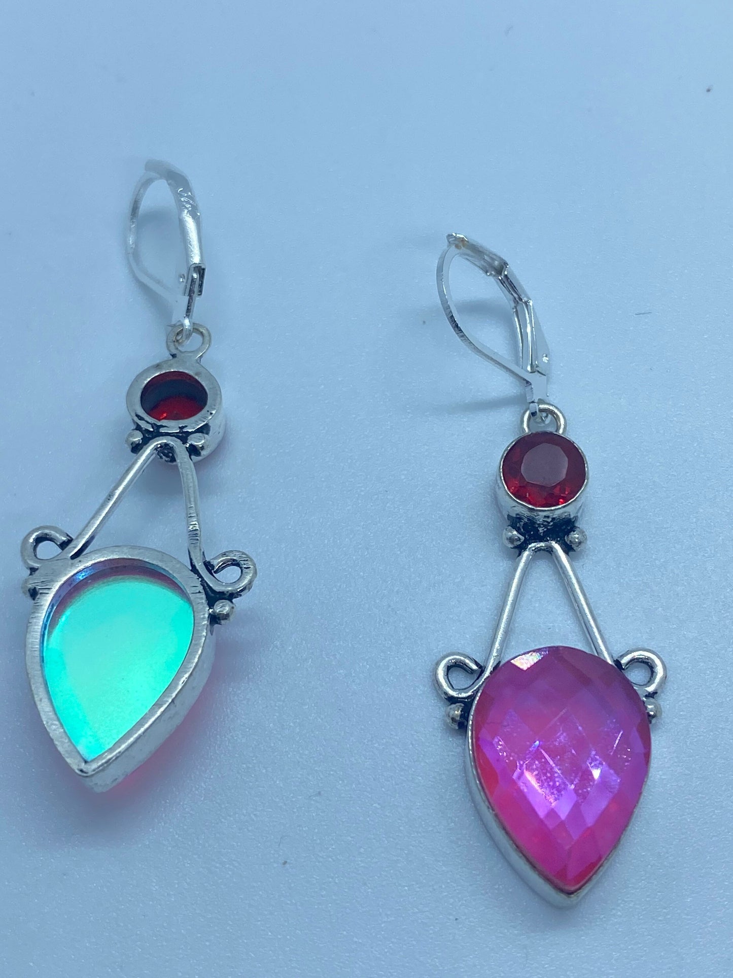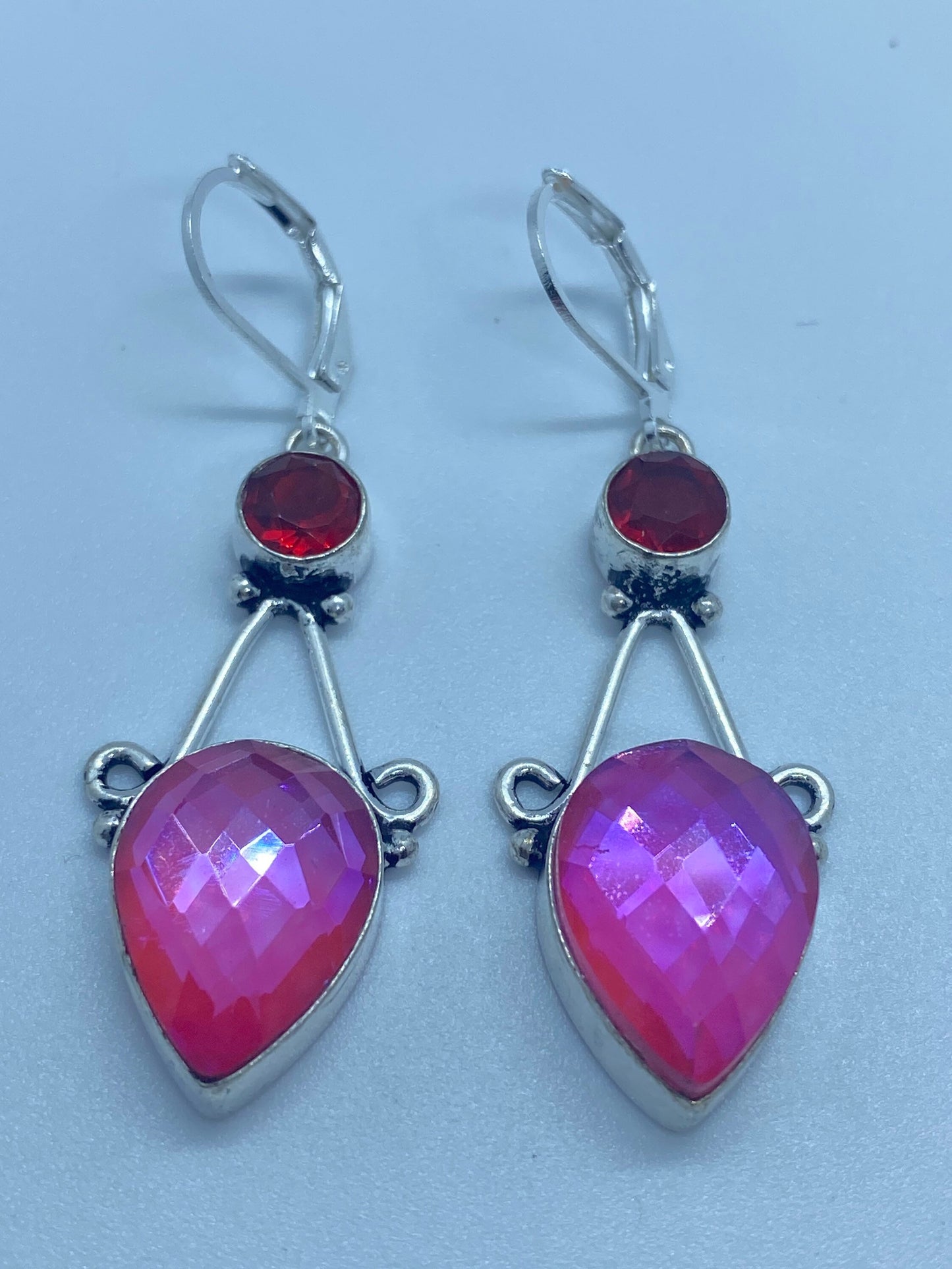Antique Vintage Pink Butterfly wing Glass Silver Dangle Earrings