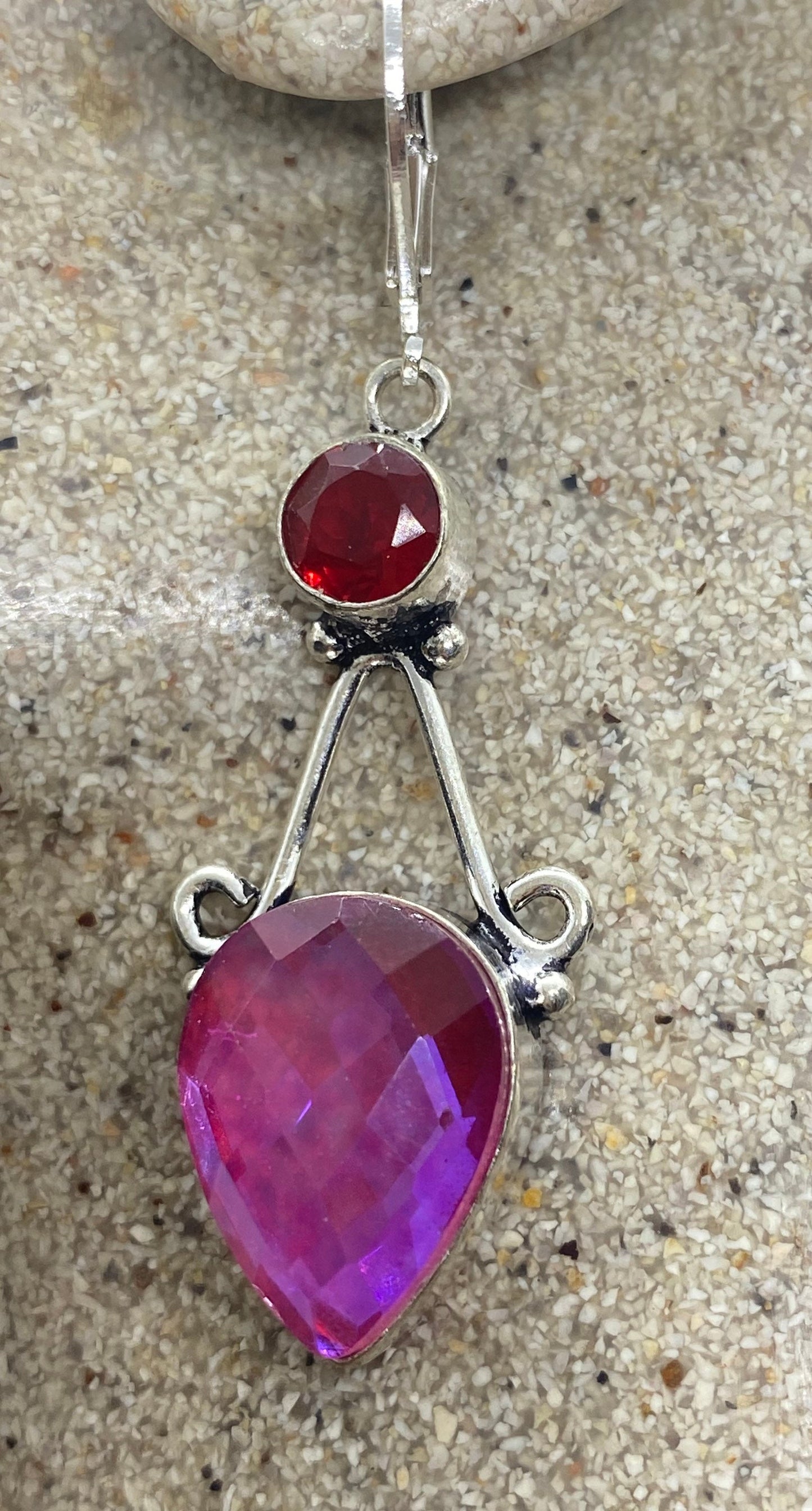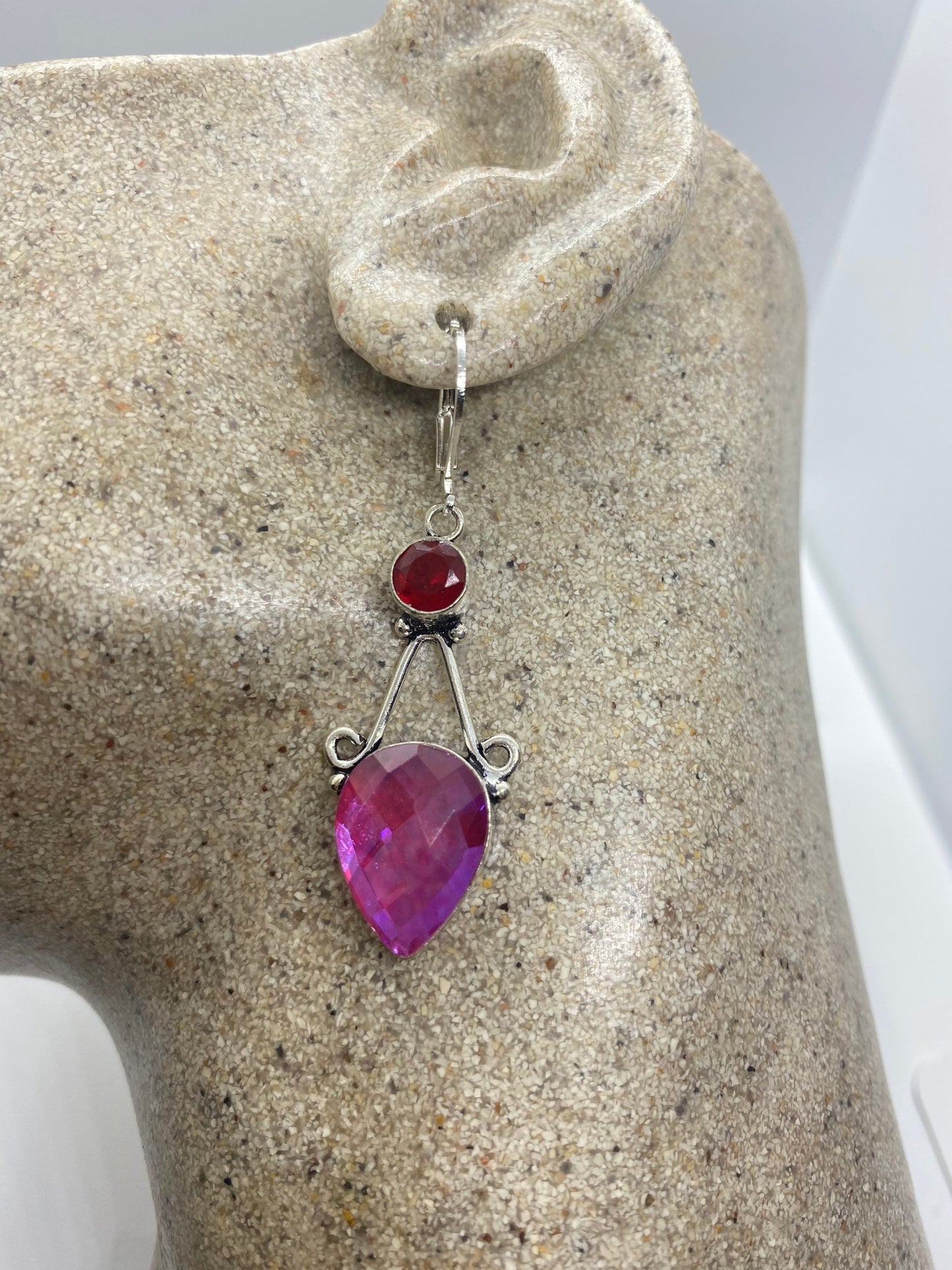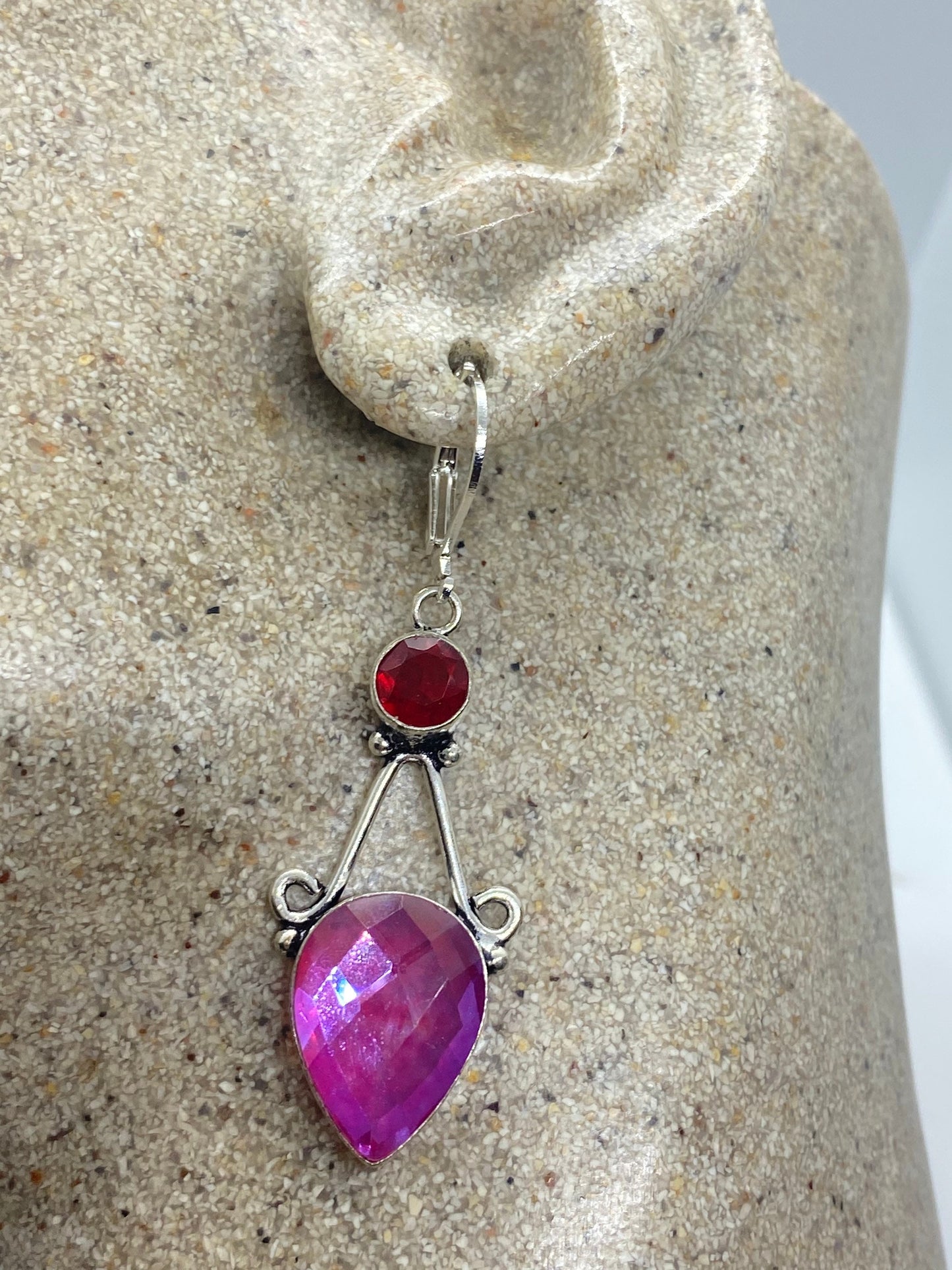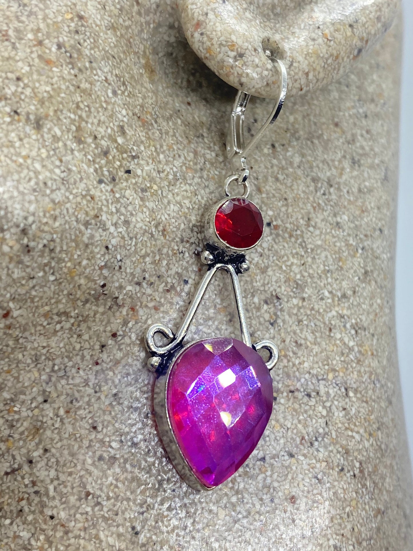 Antique Vintage Pink Butterfly wing Glass Silver Dangle Earrings