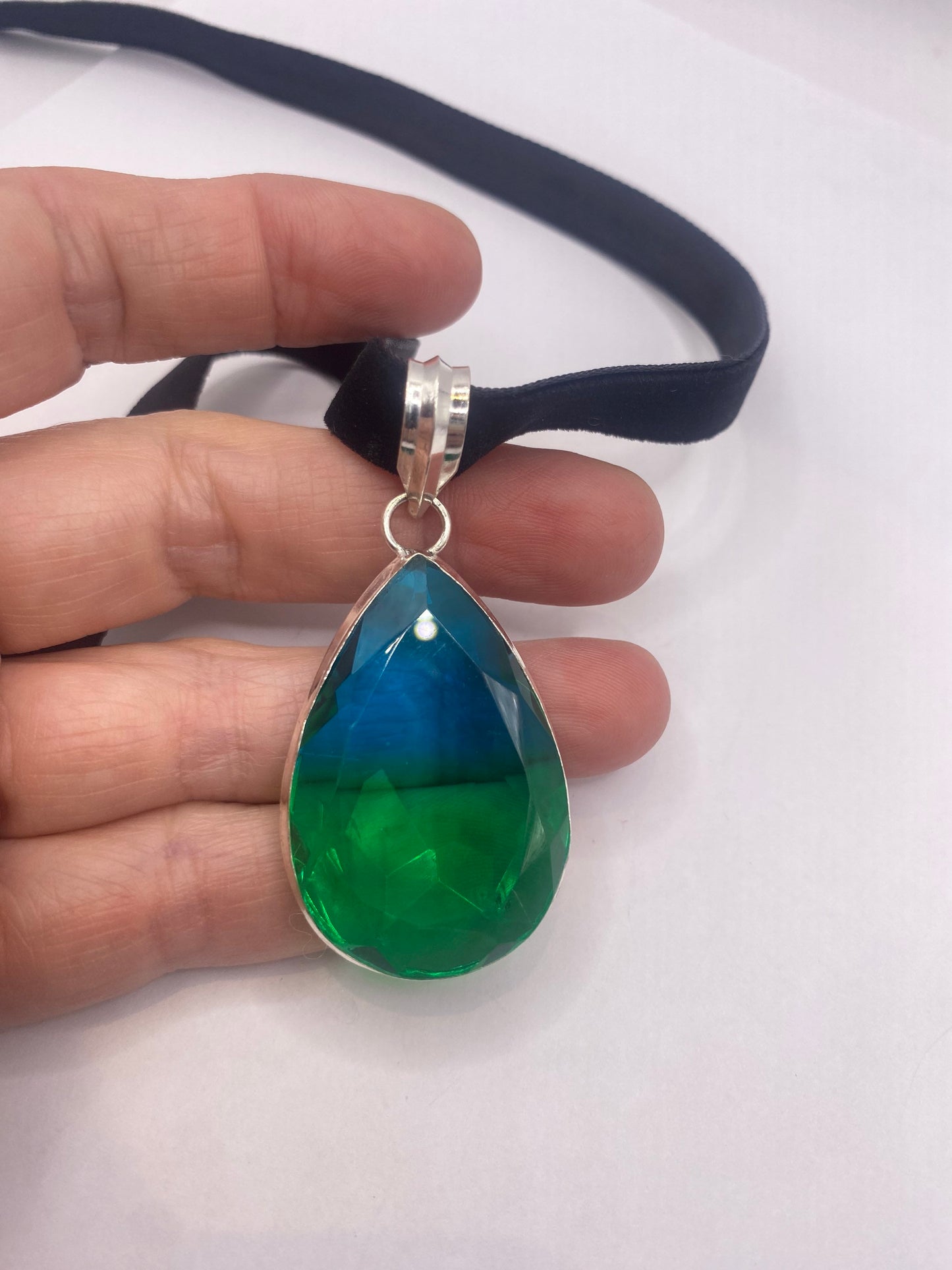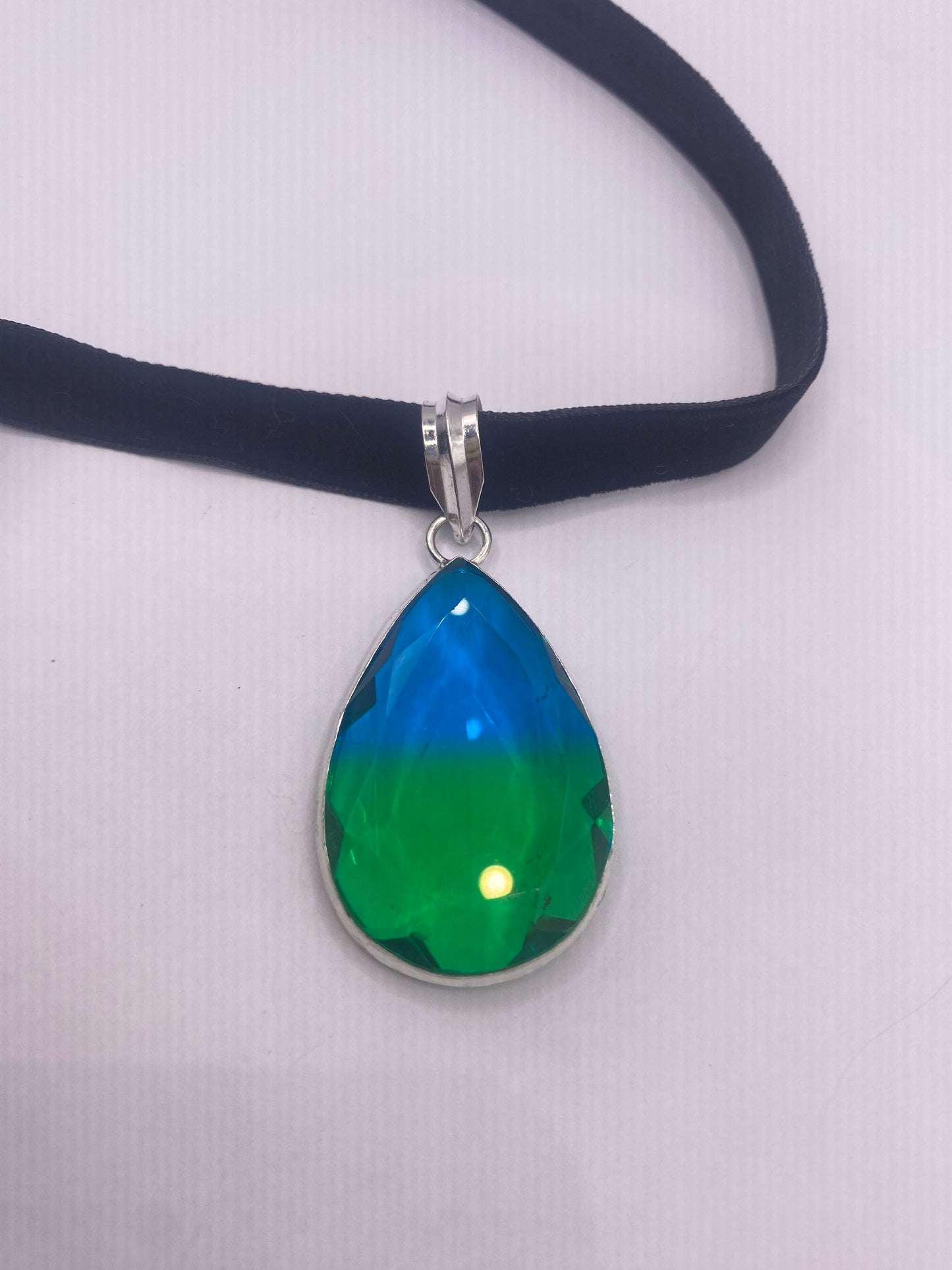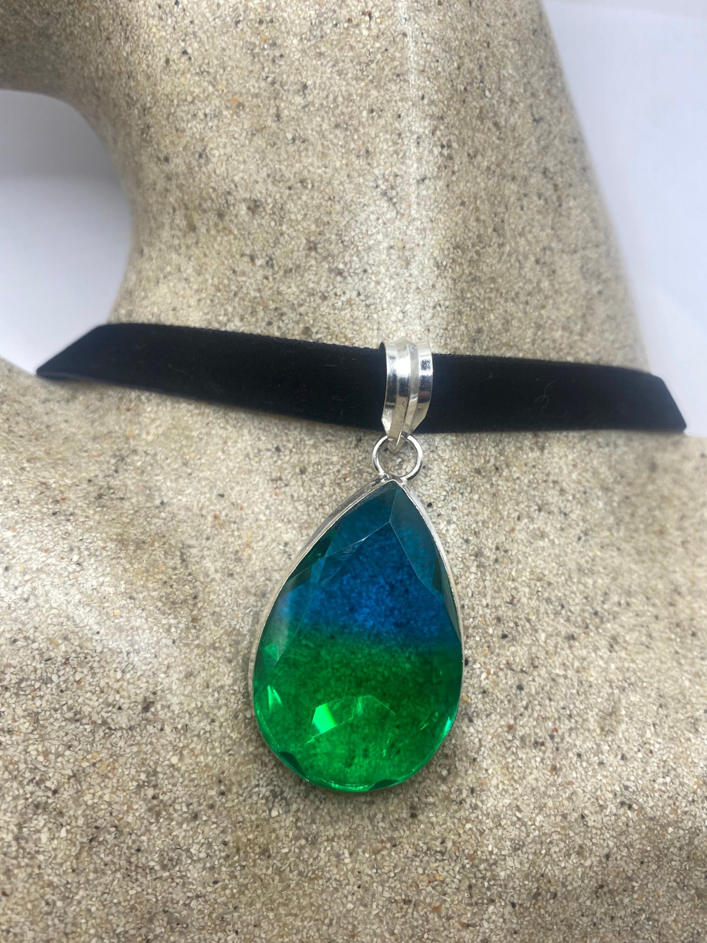Blue Green Handmade Gothic Silver Finished Genuine Facetted Antique Volcanic Glass Choker Necklace