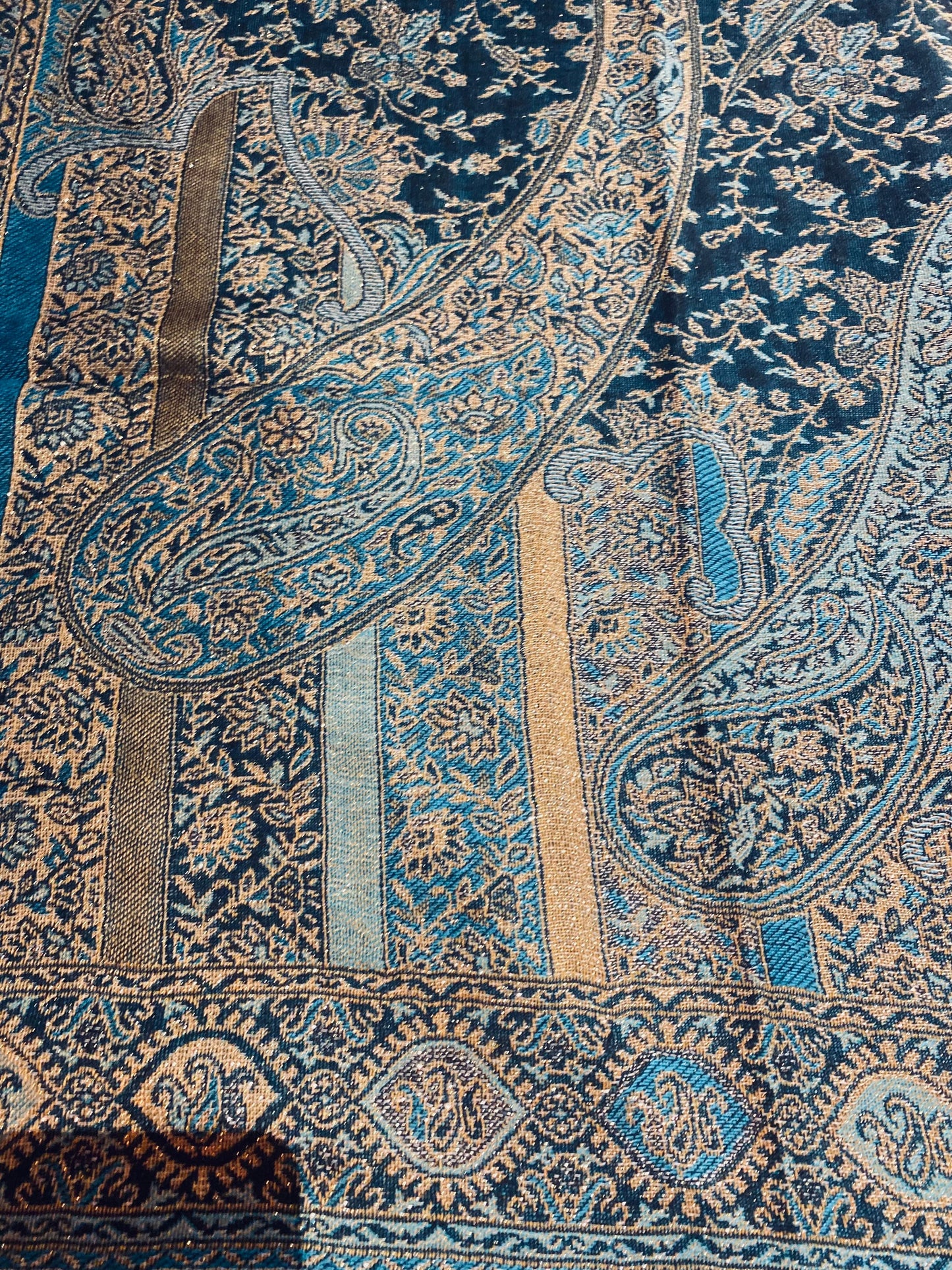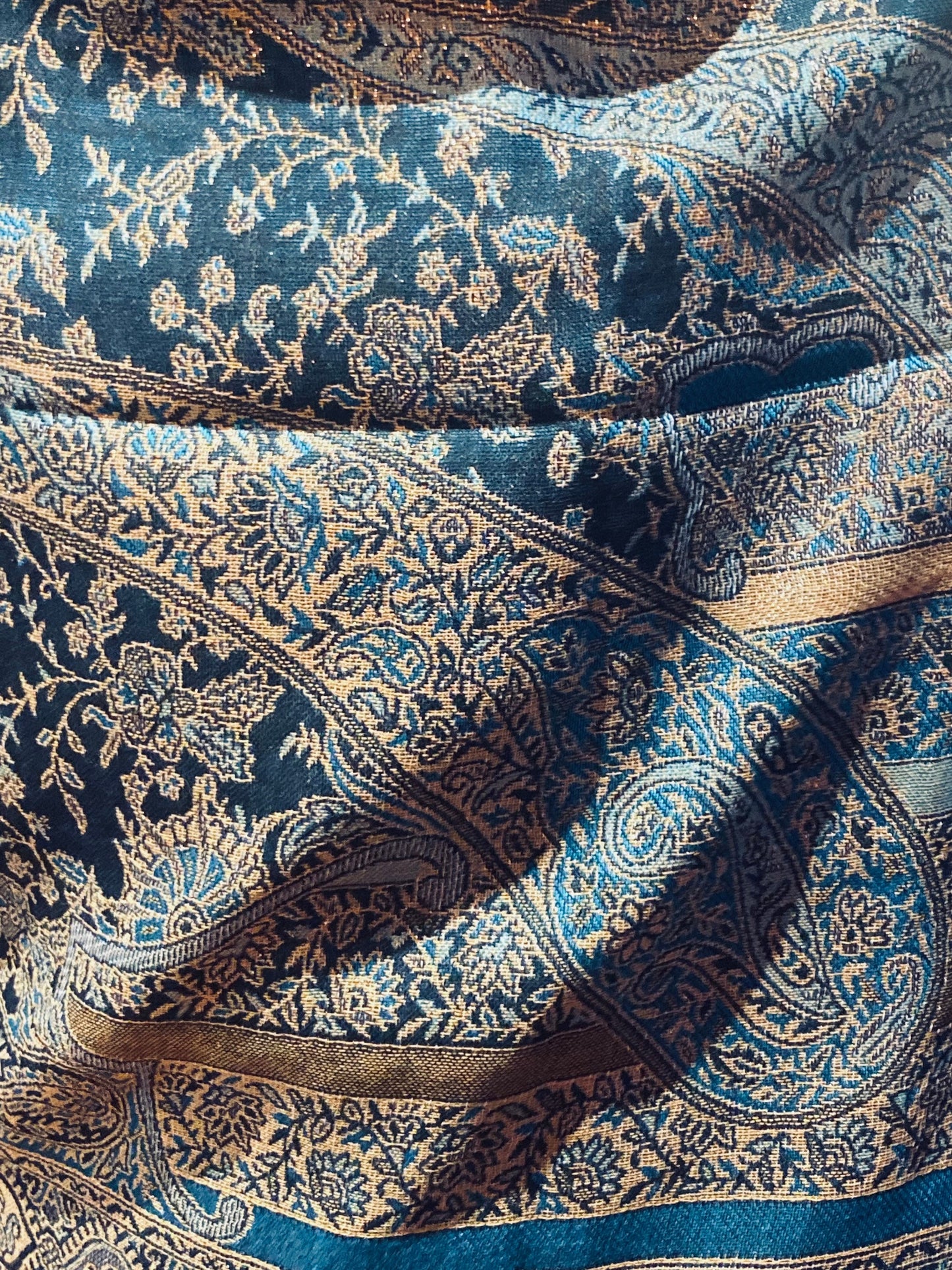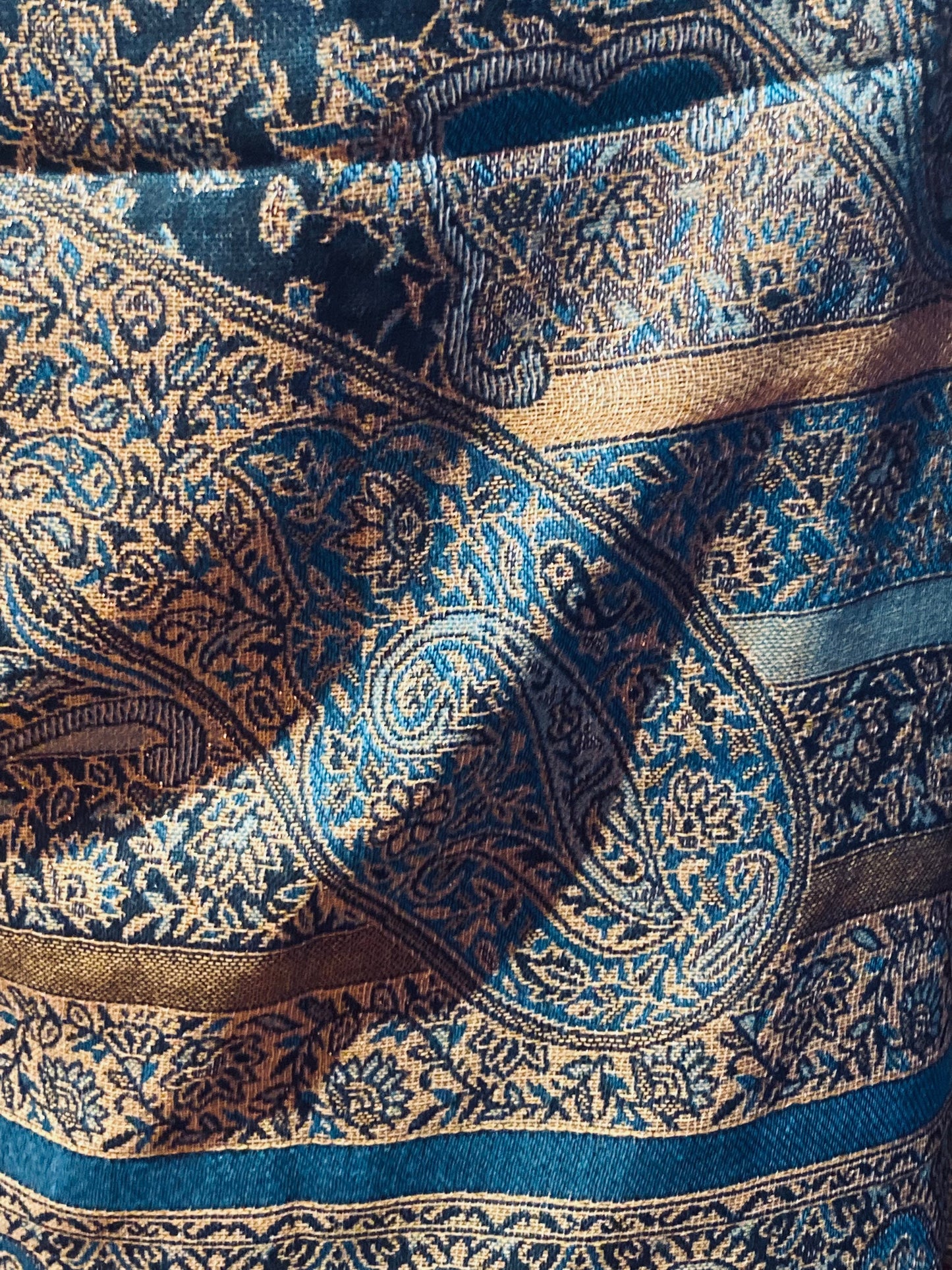Jamawar Blue Gold Paisley Brocade Pashmina Scarf Wrap Shawl