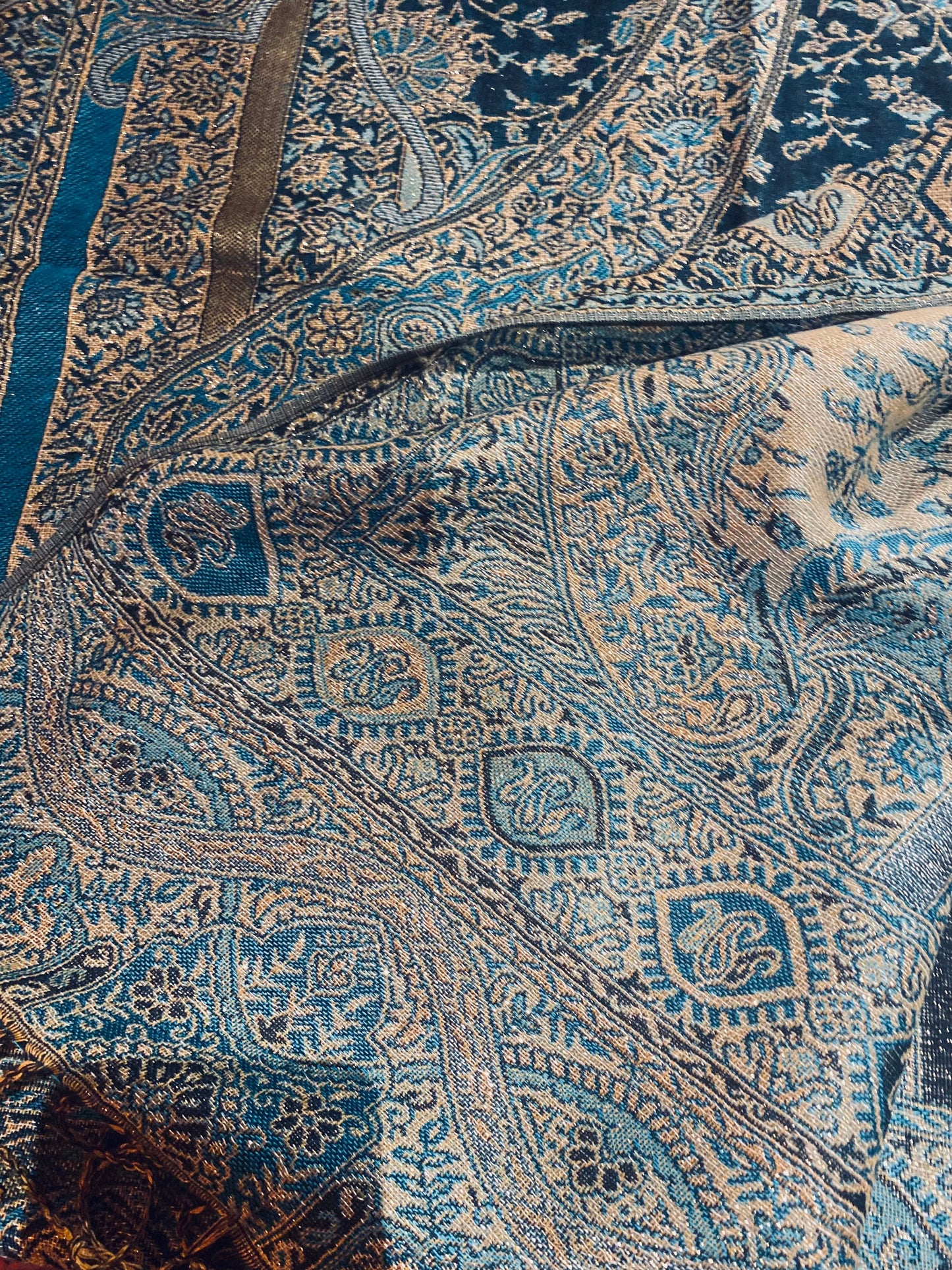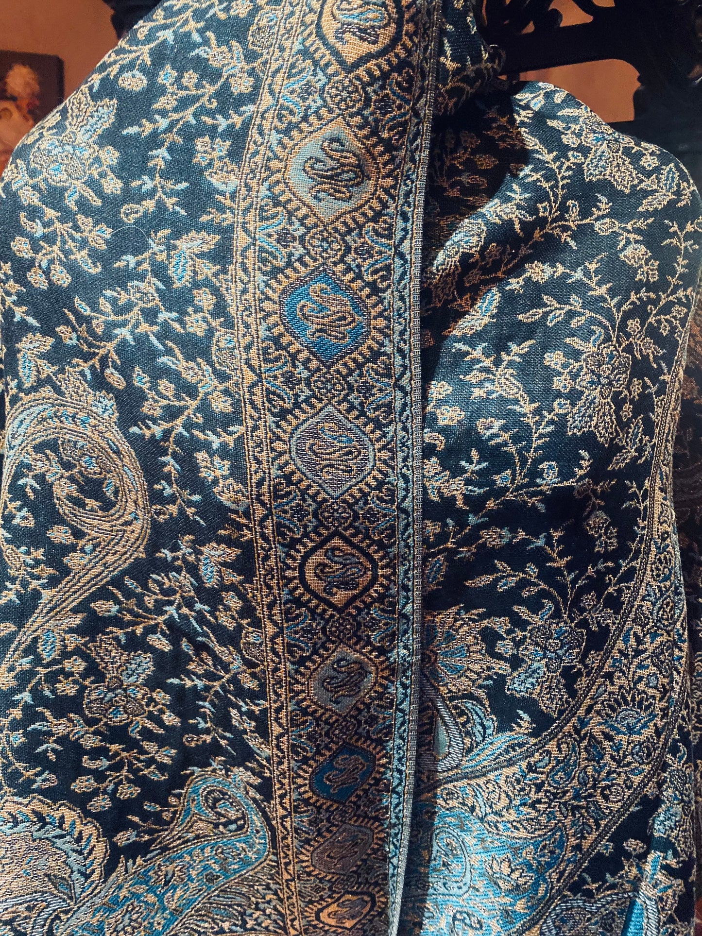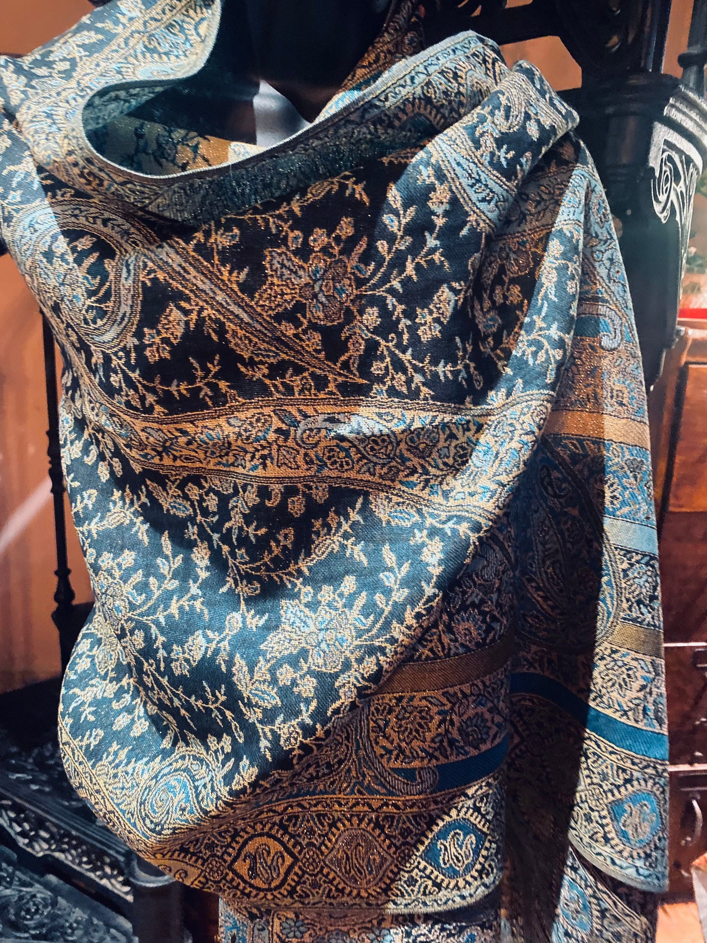 Jamawar Blue Gold Paisley Brocade Pashmina Scarf Wrap Shawl