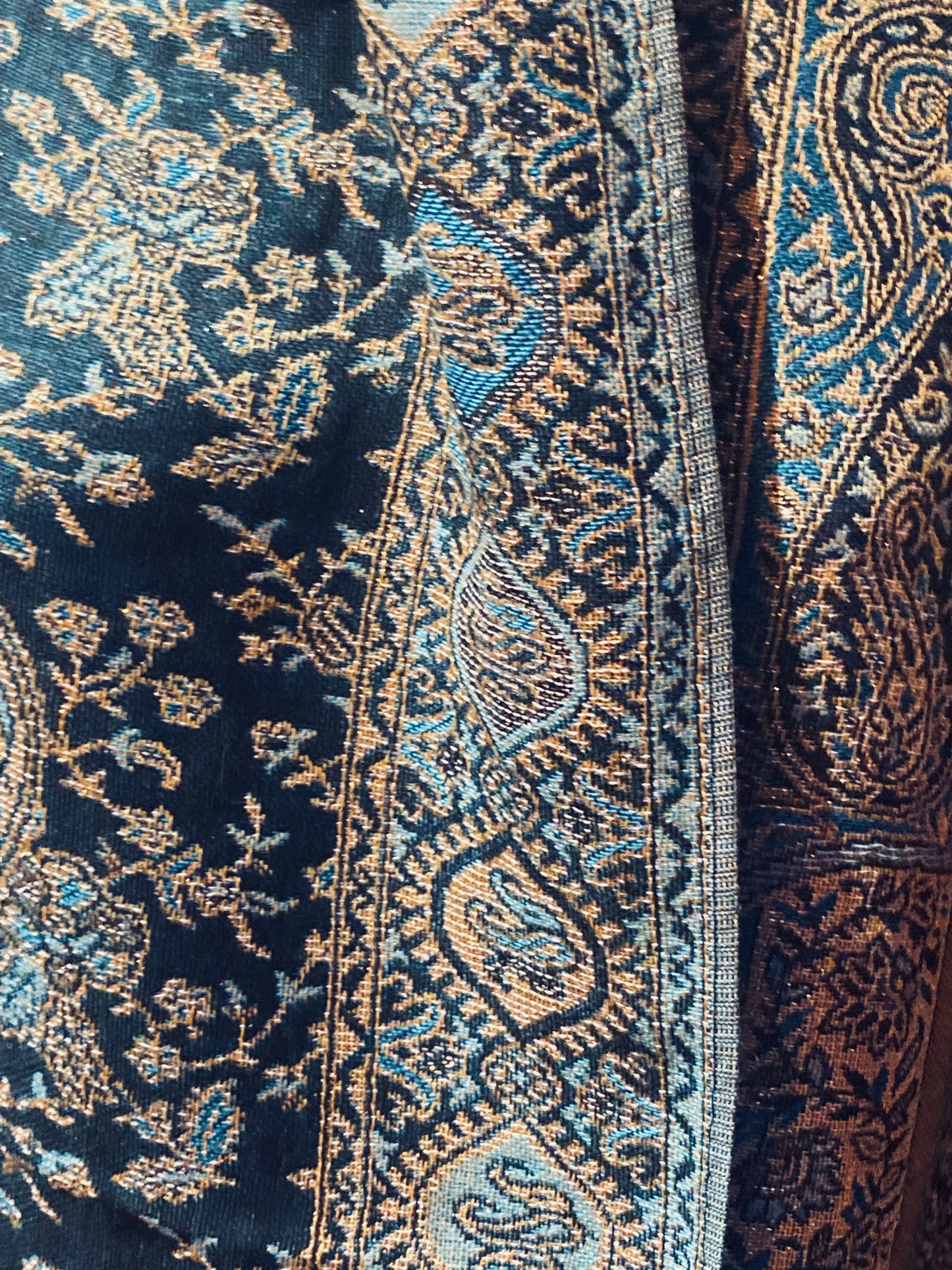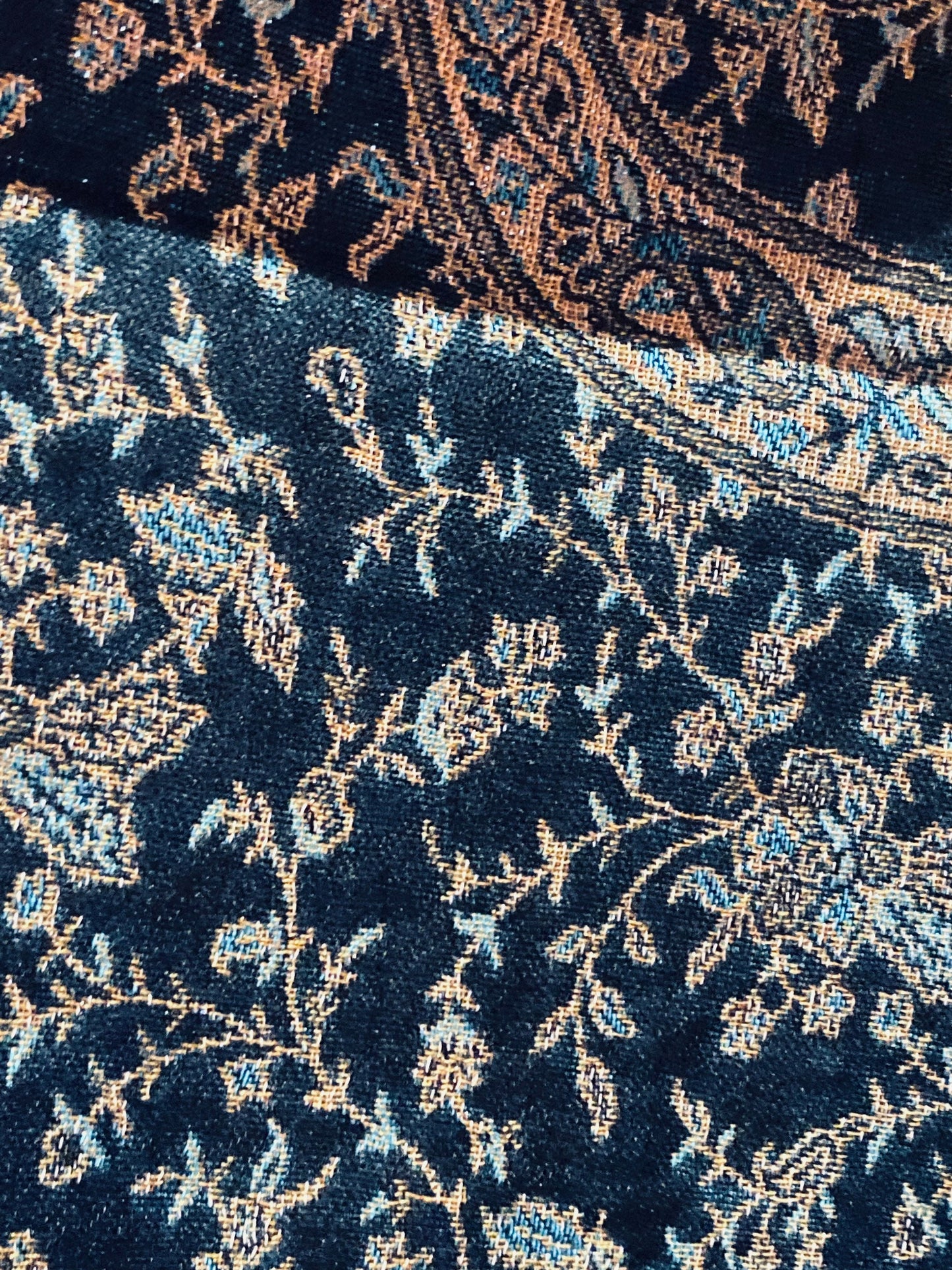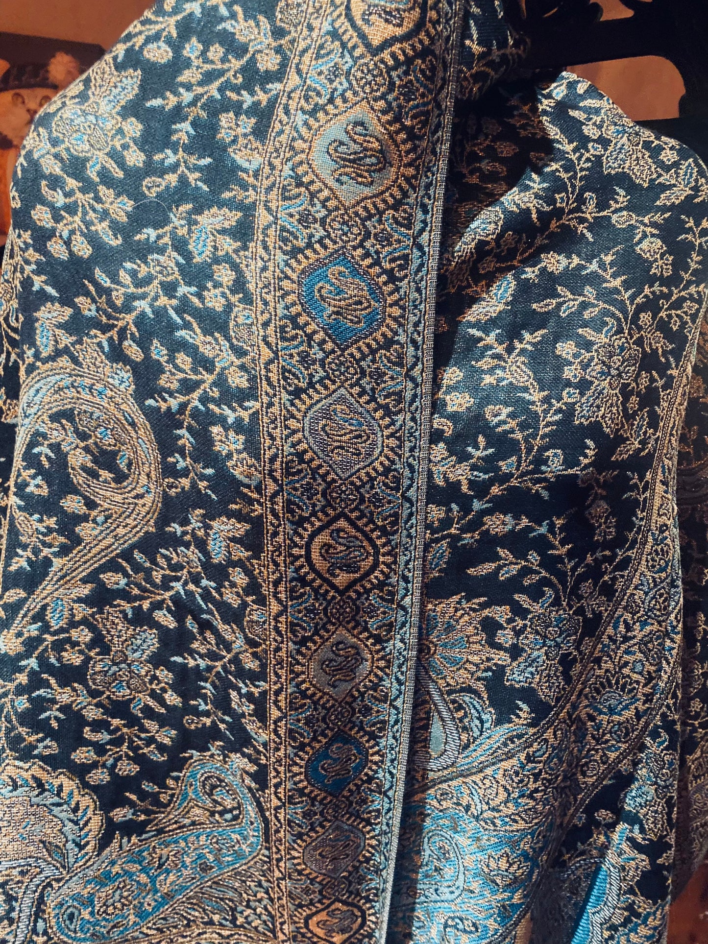 This vintage-styled shawl features our paisley brocade design, styled from ancient Jamawar Kashmiri motifs