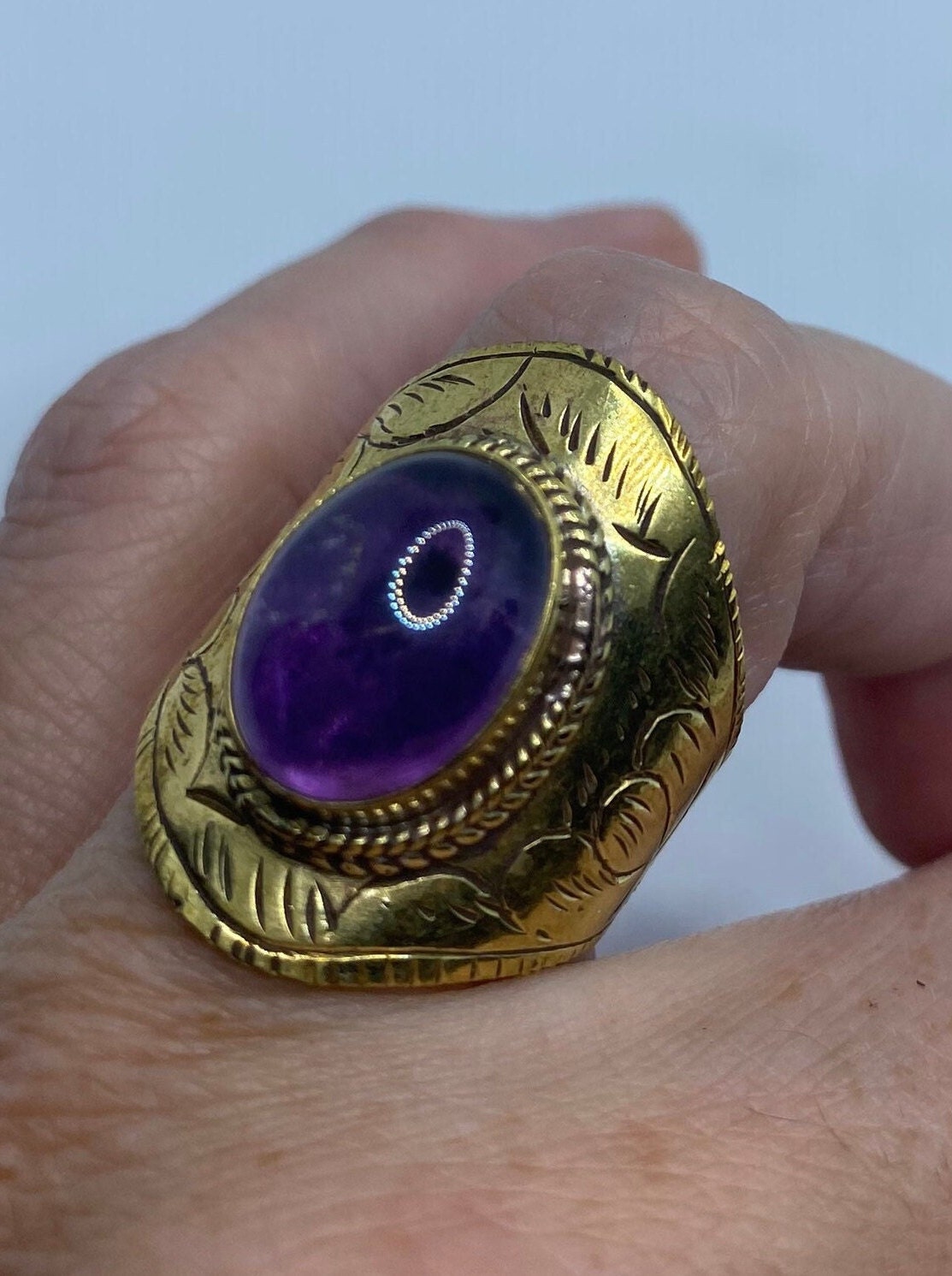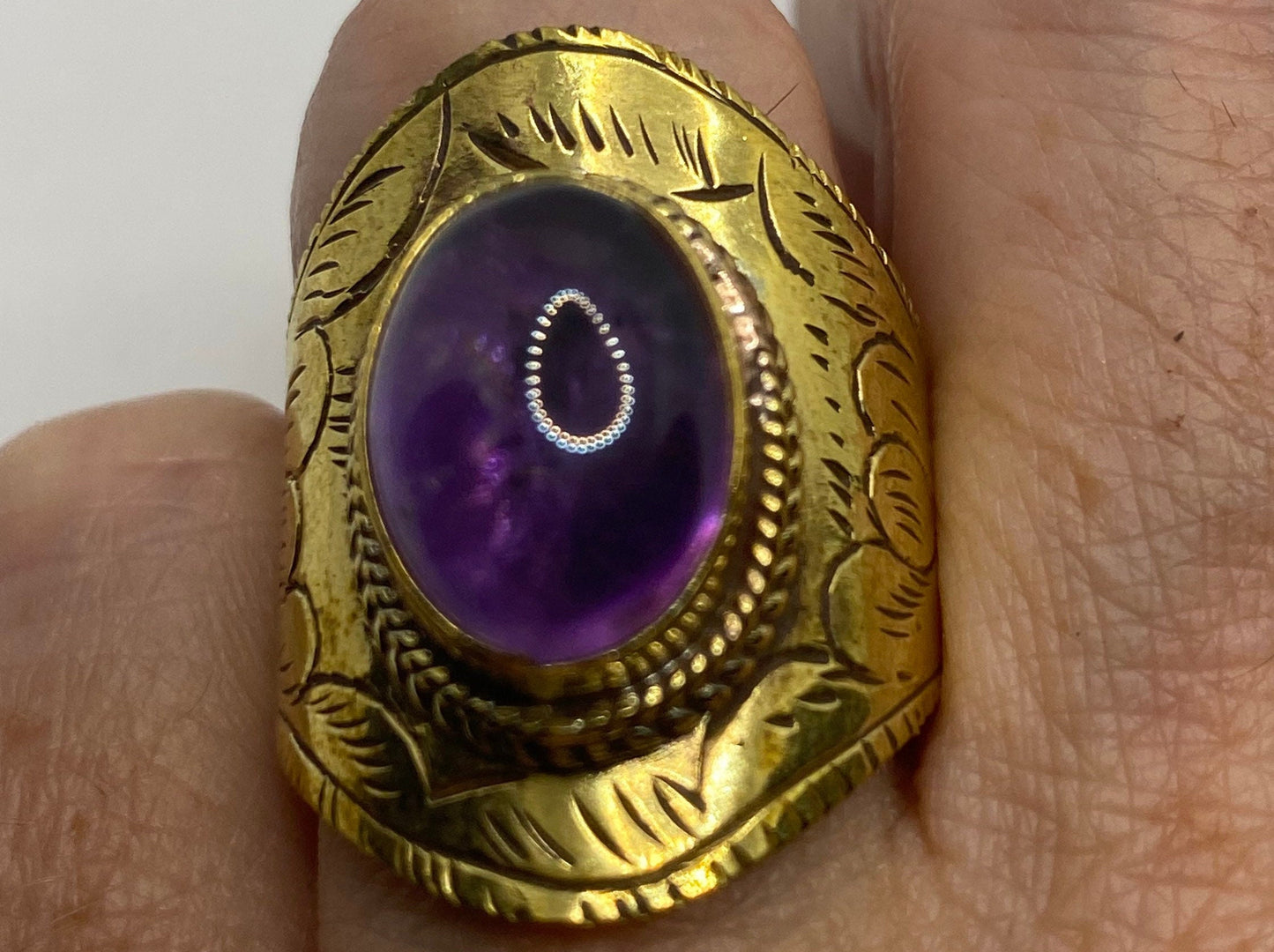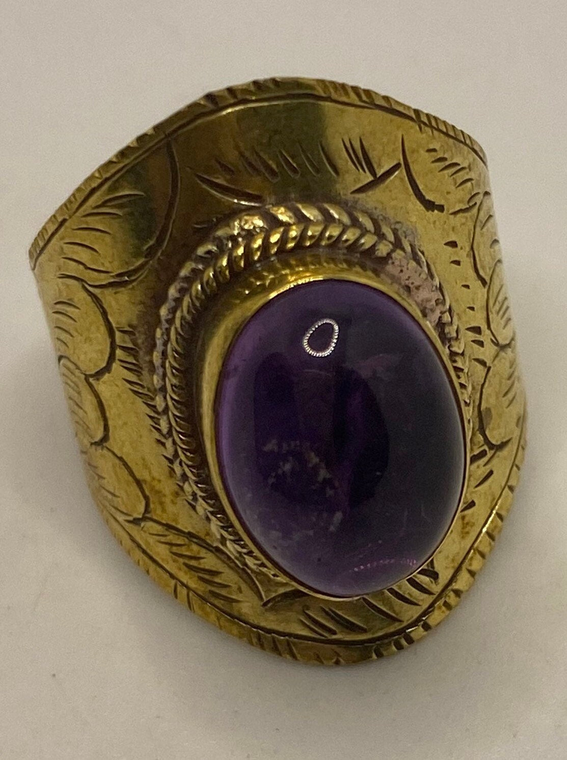 Lovely polished brass has the look of gold set with a huge amethyst deep color