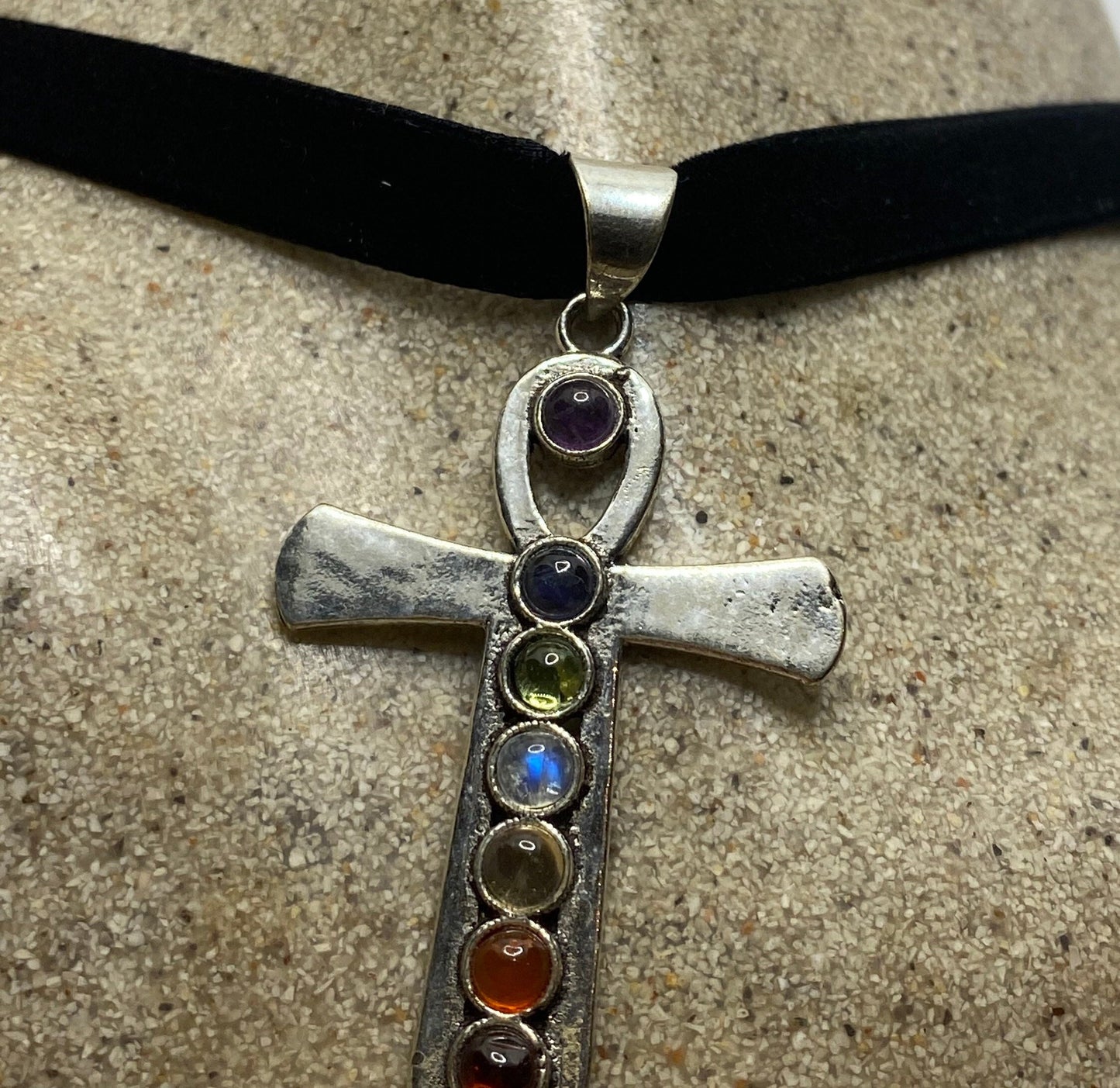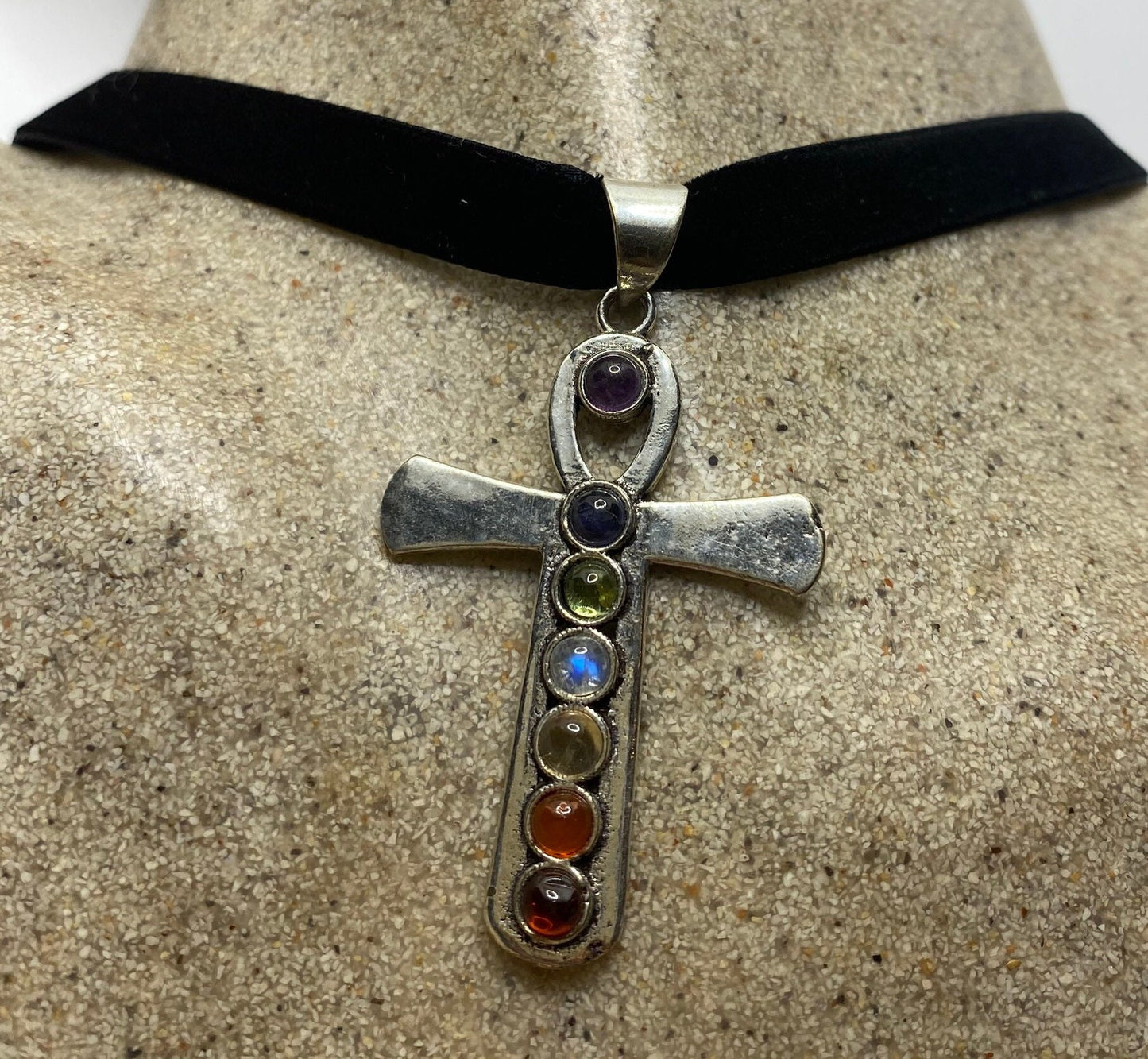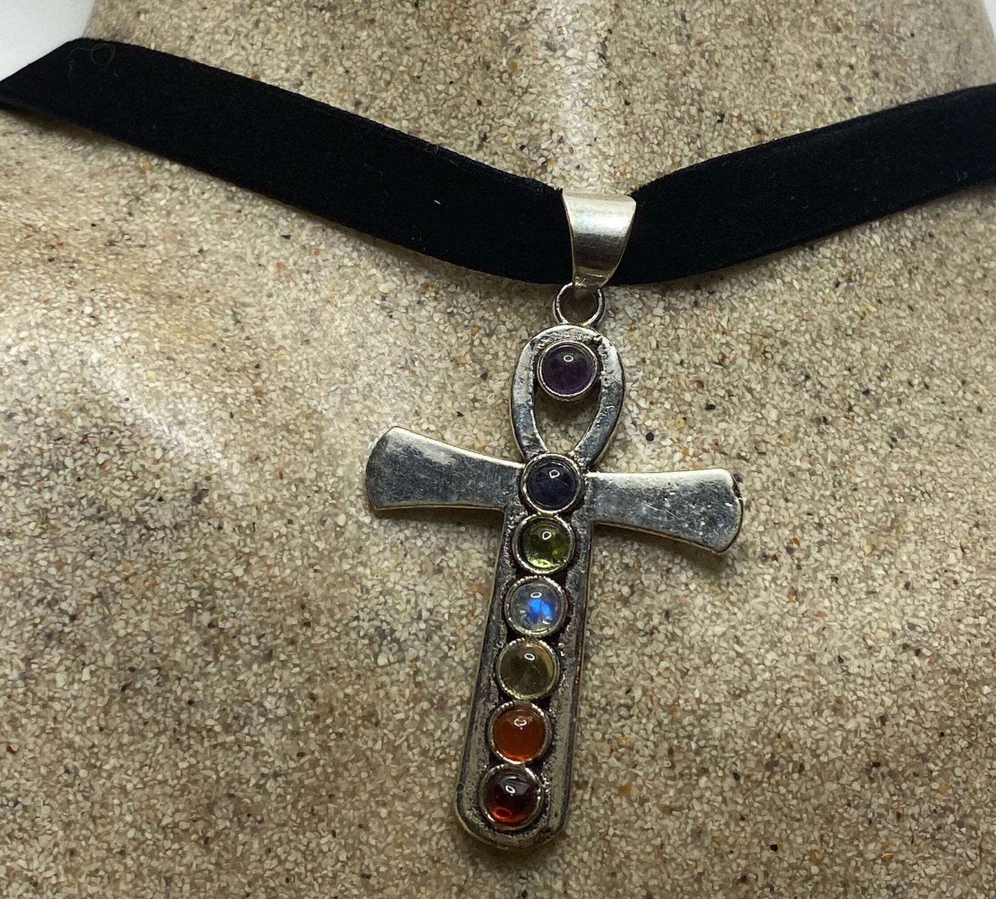 Vintage Ankh Chakra Stones Bronze Velvet Choker Necklace