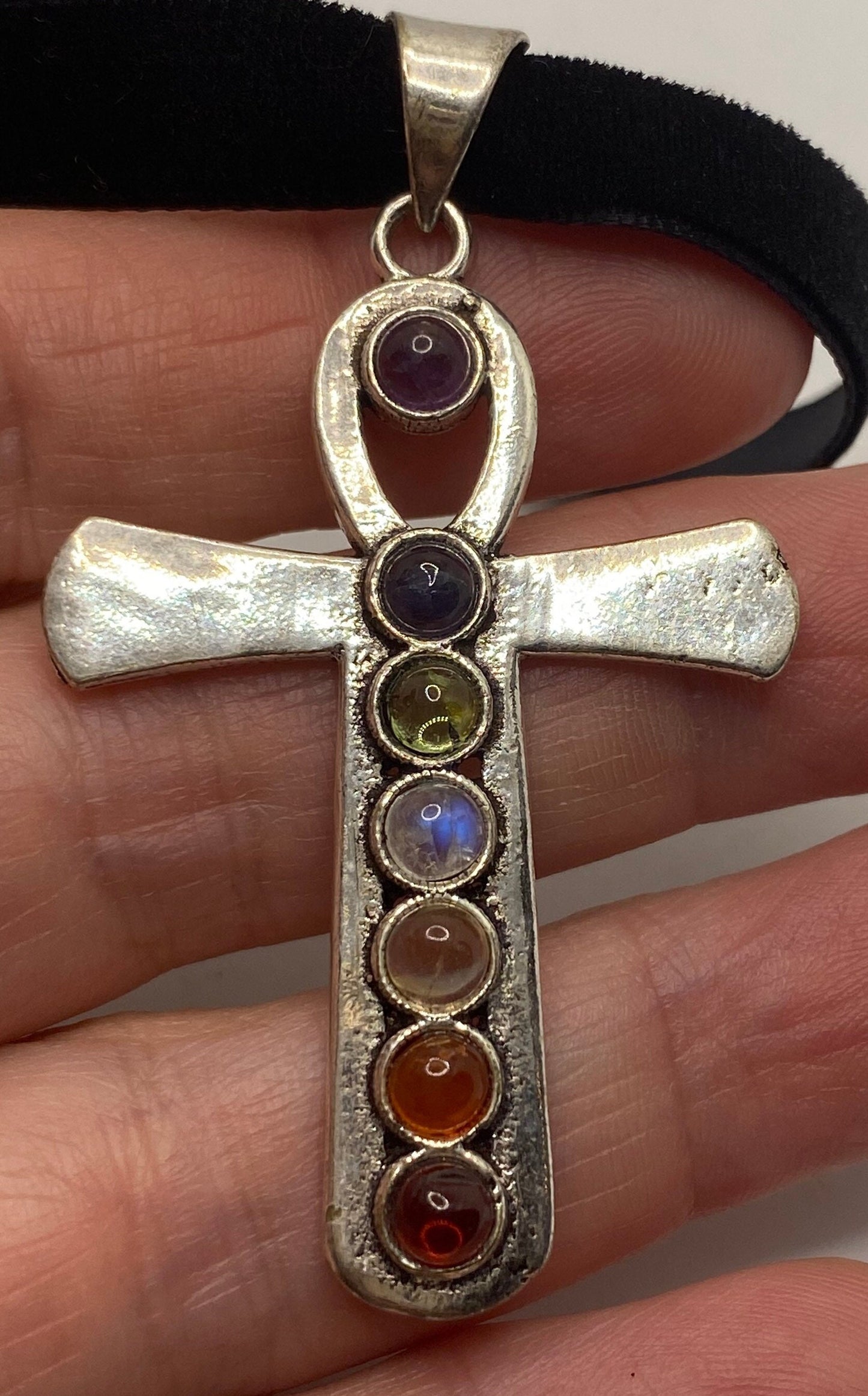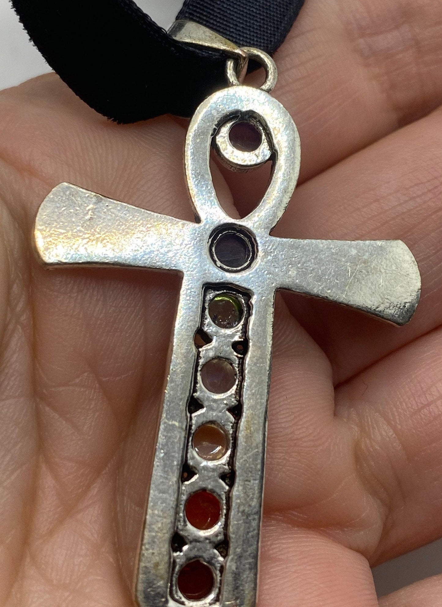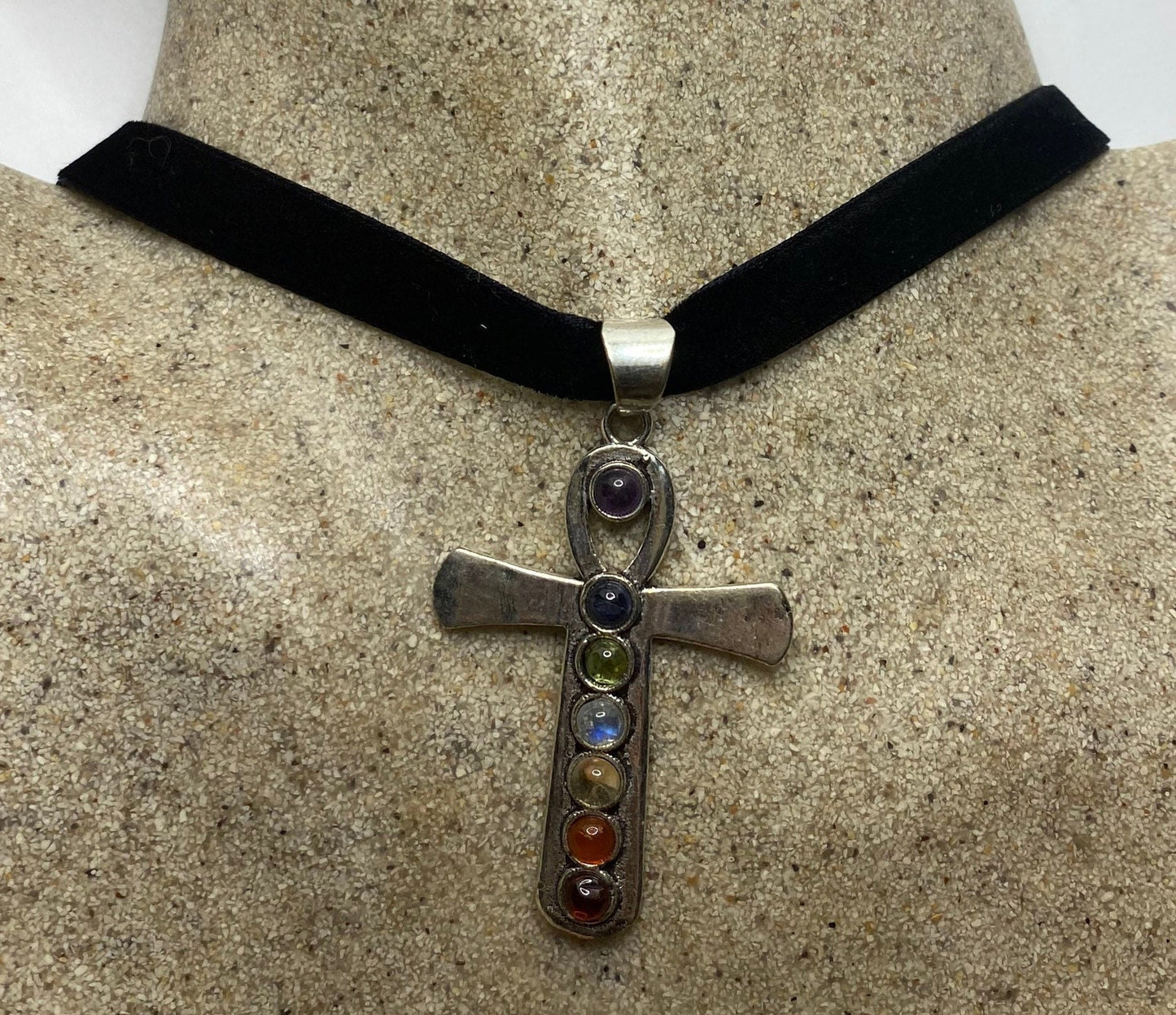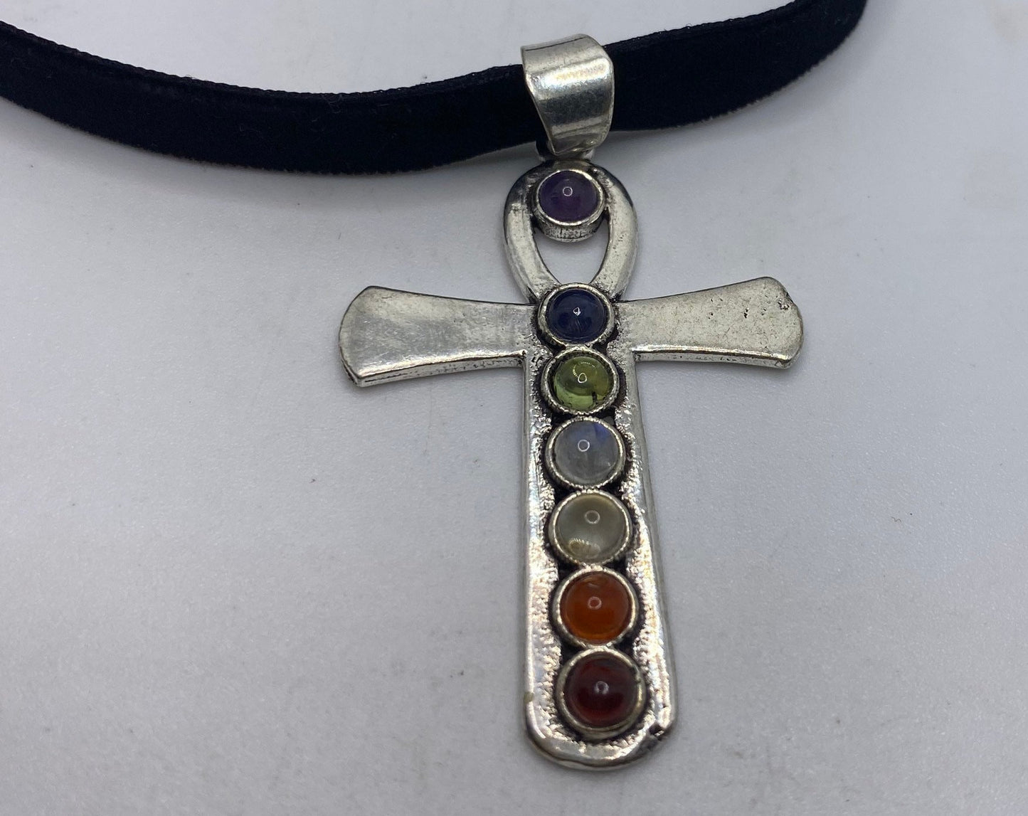 Vintage Ankh Chakra Stones Bronze Velvet Choker Necklace