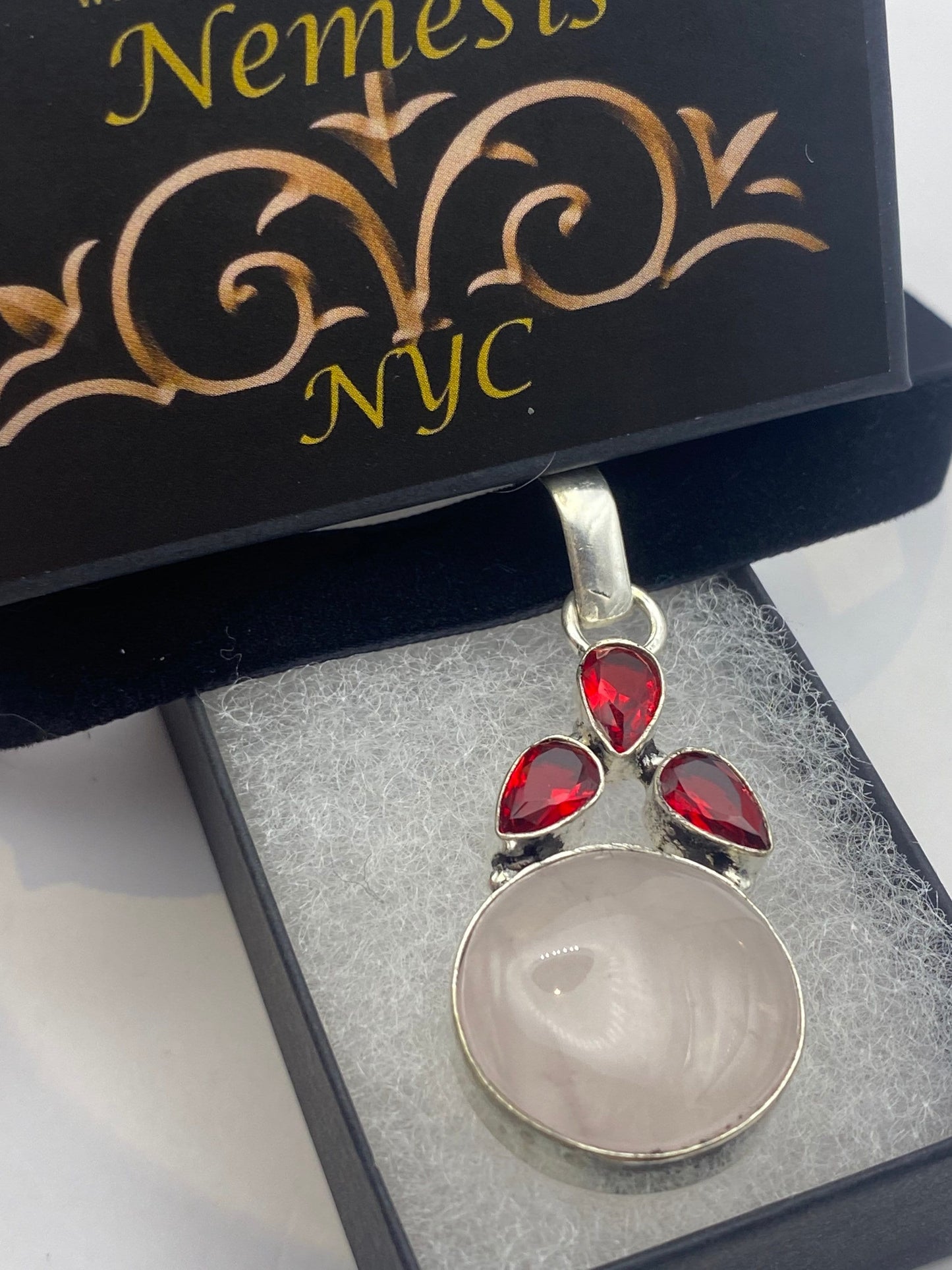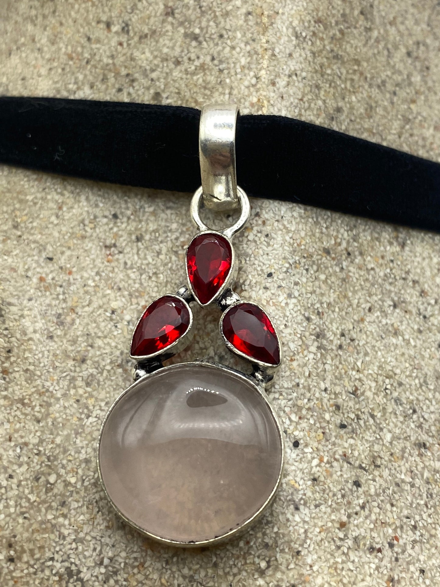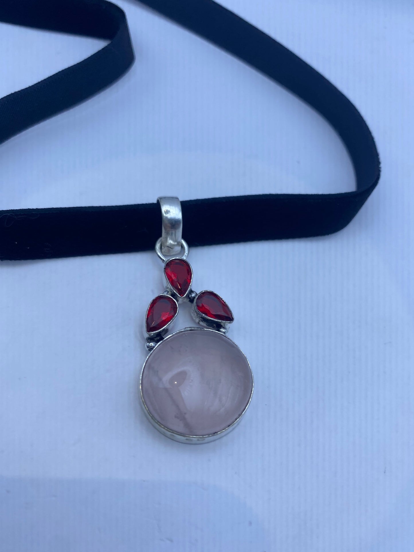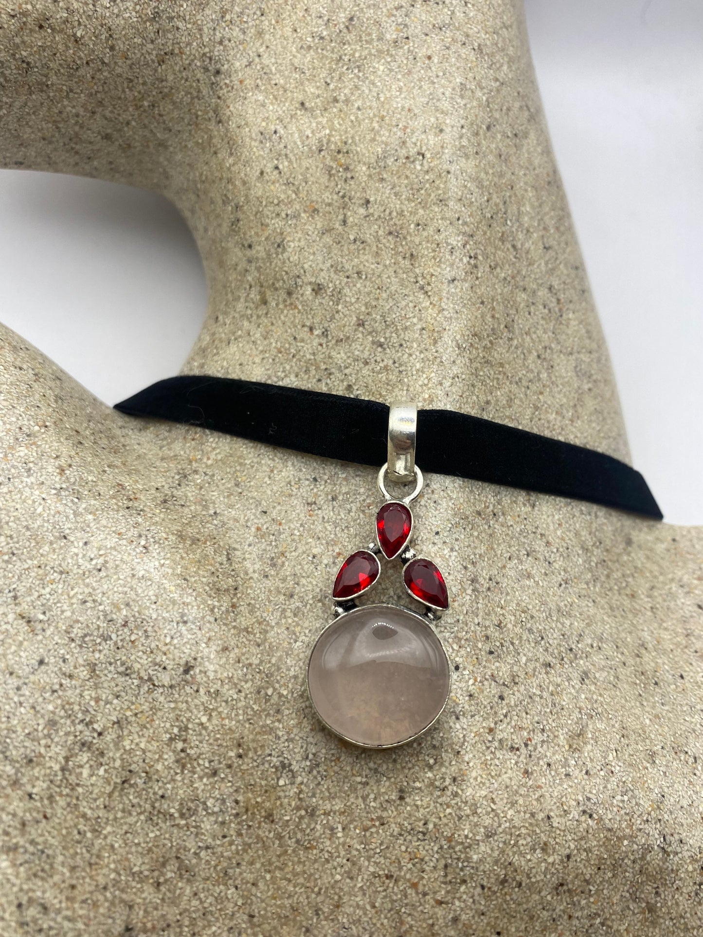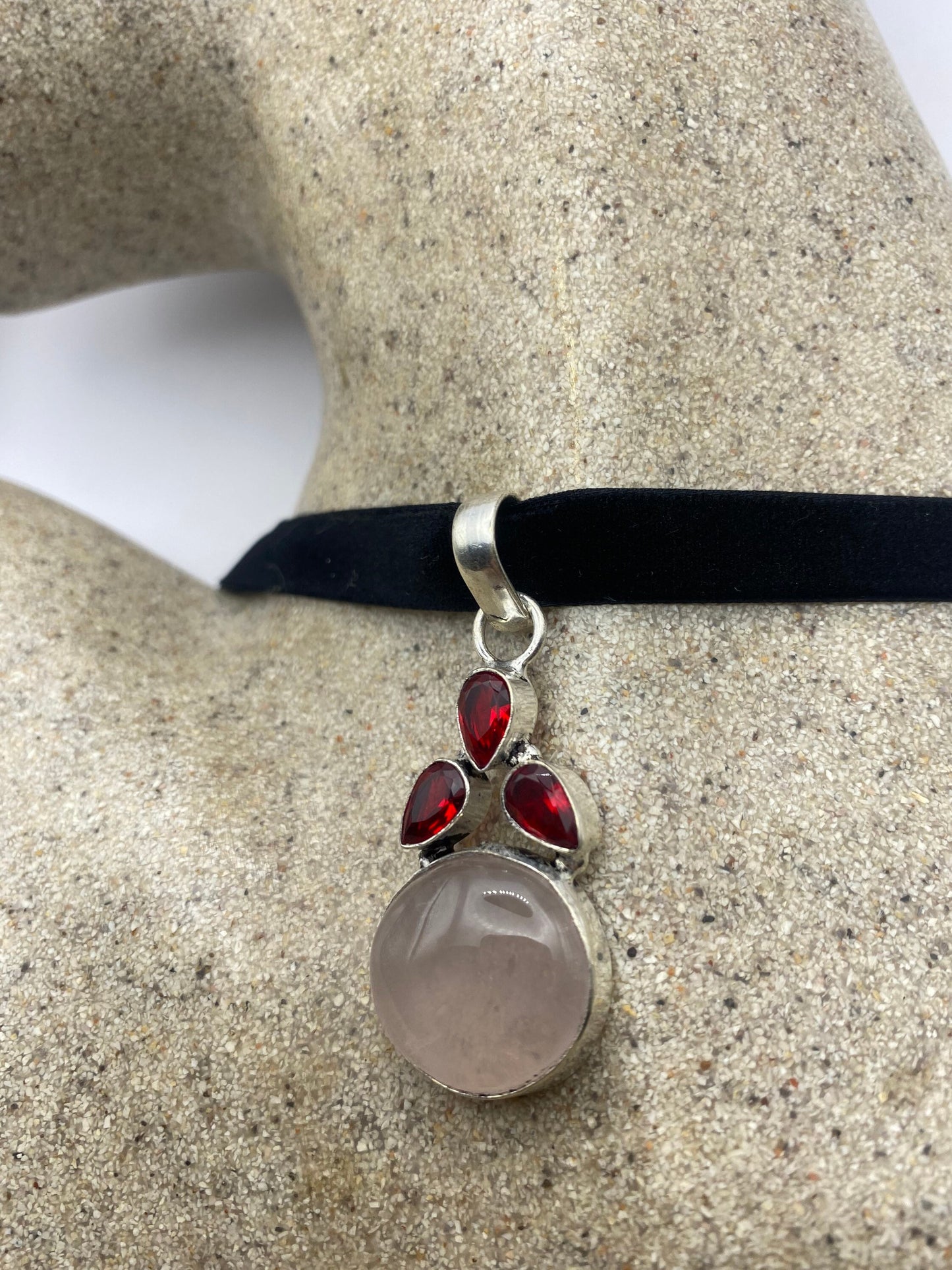 Vintage Antique Pink Rose Quartz Choker Necklace set with ruby glass