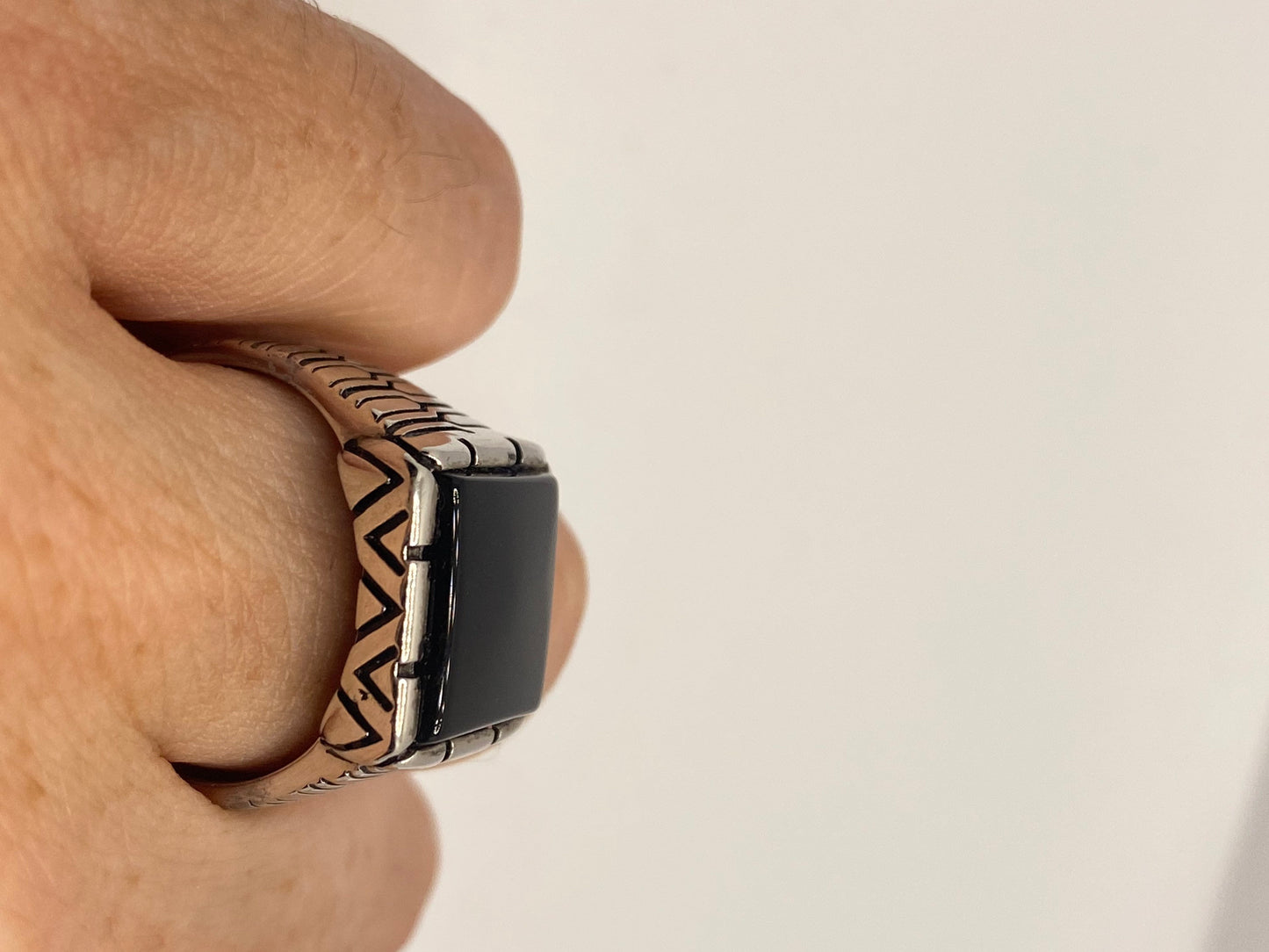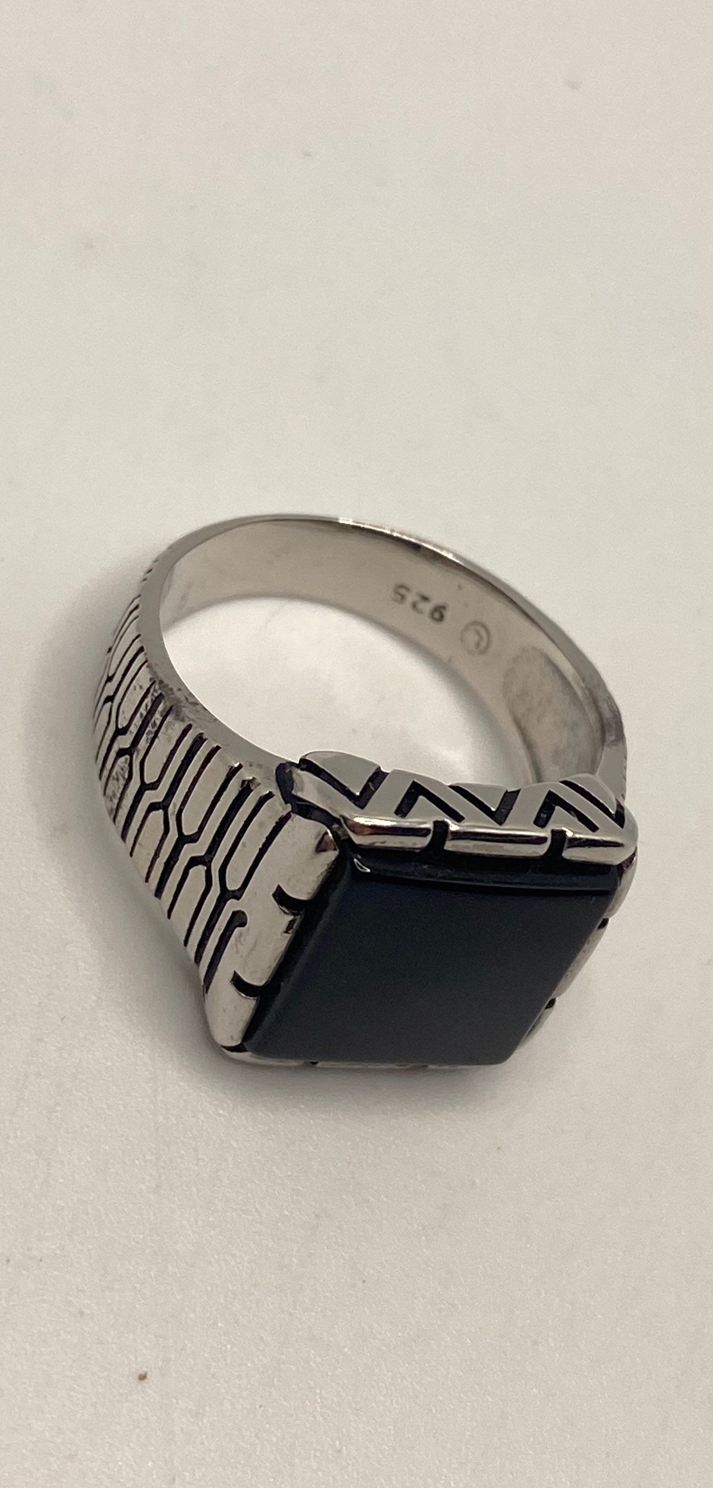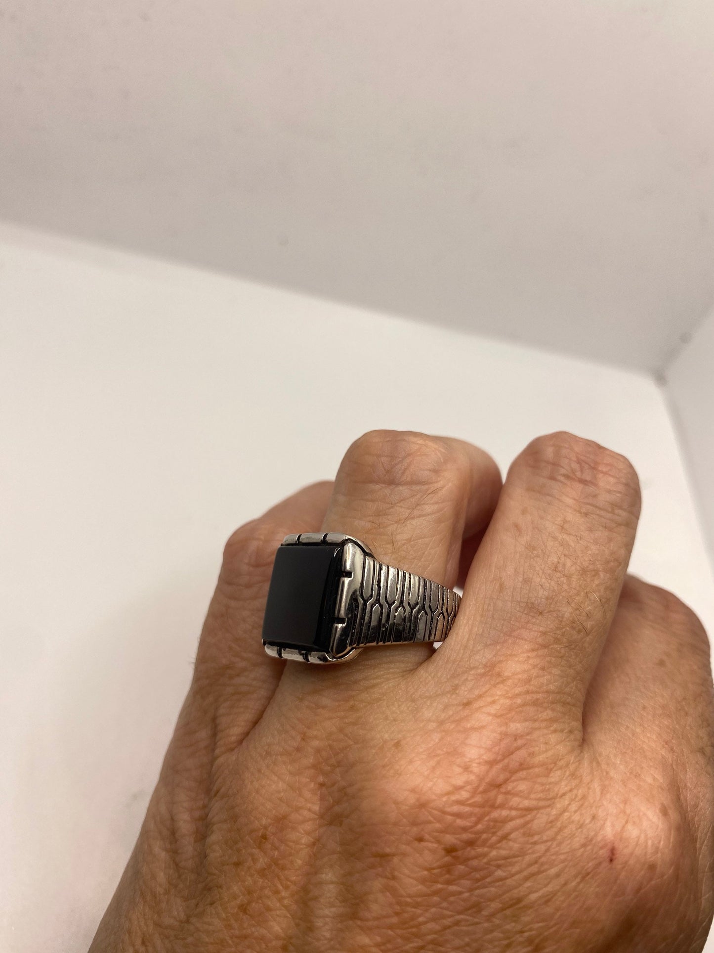 This is a modern-styled vintage onyx mens ring set in 925 sterling silver and genuine black onyx.