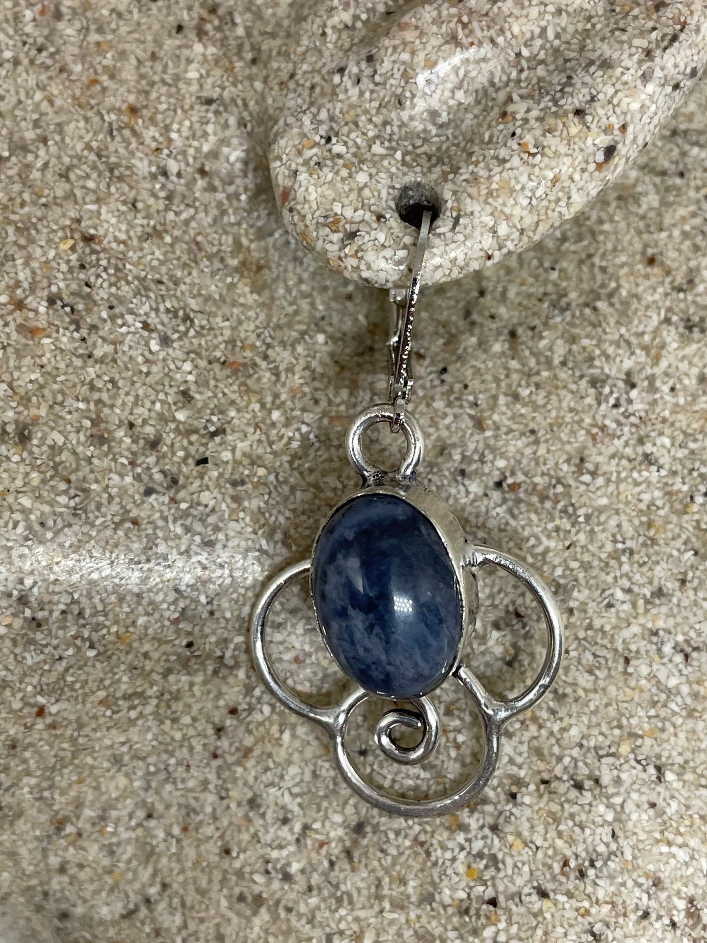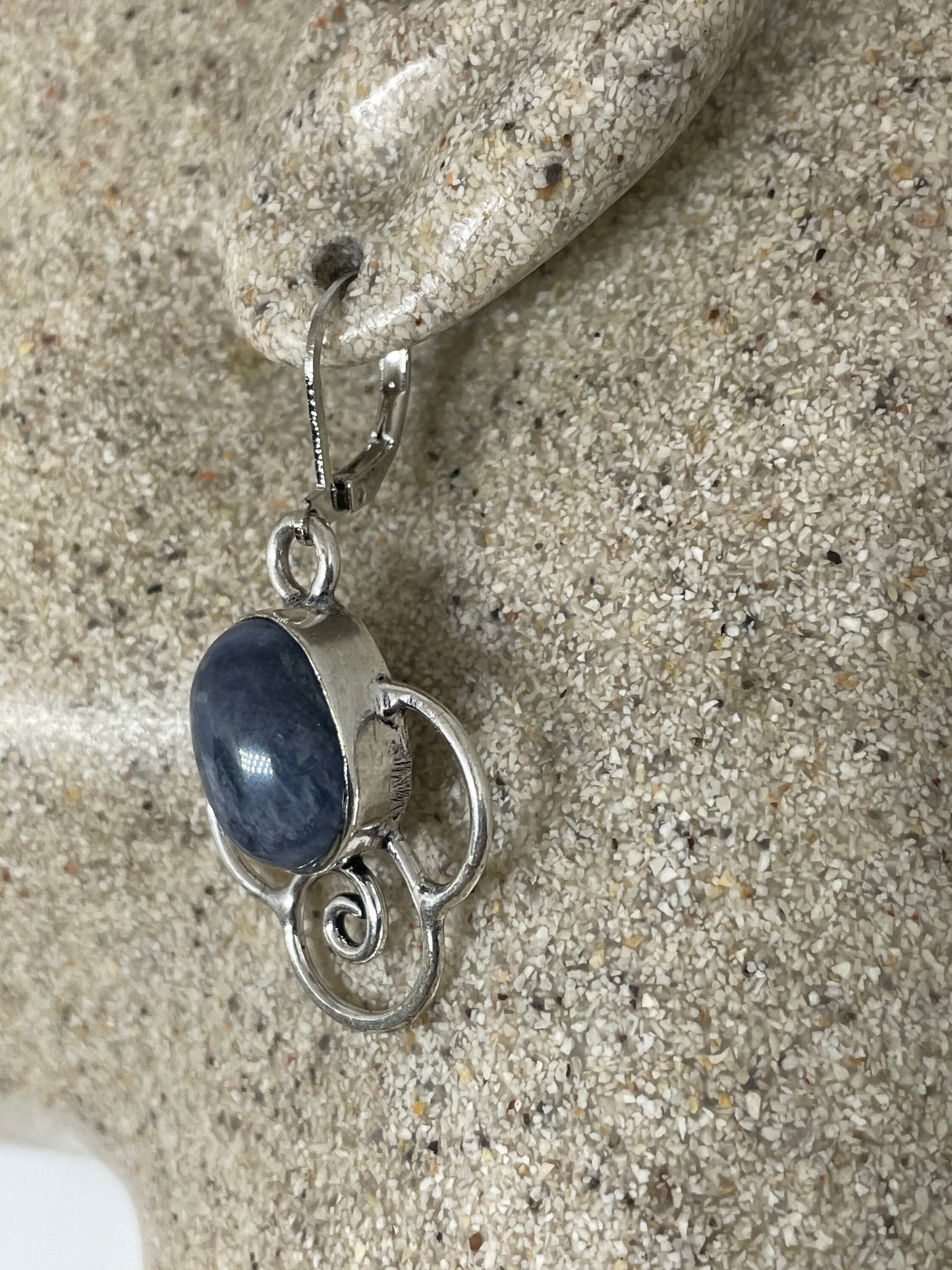 Delicate and detailed hand set Antique blue chalcedony with dolphins and Silver lever back earrings