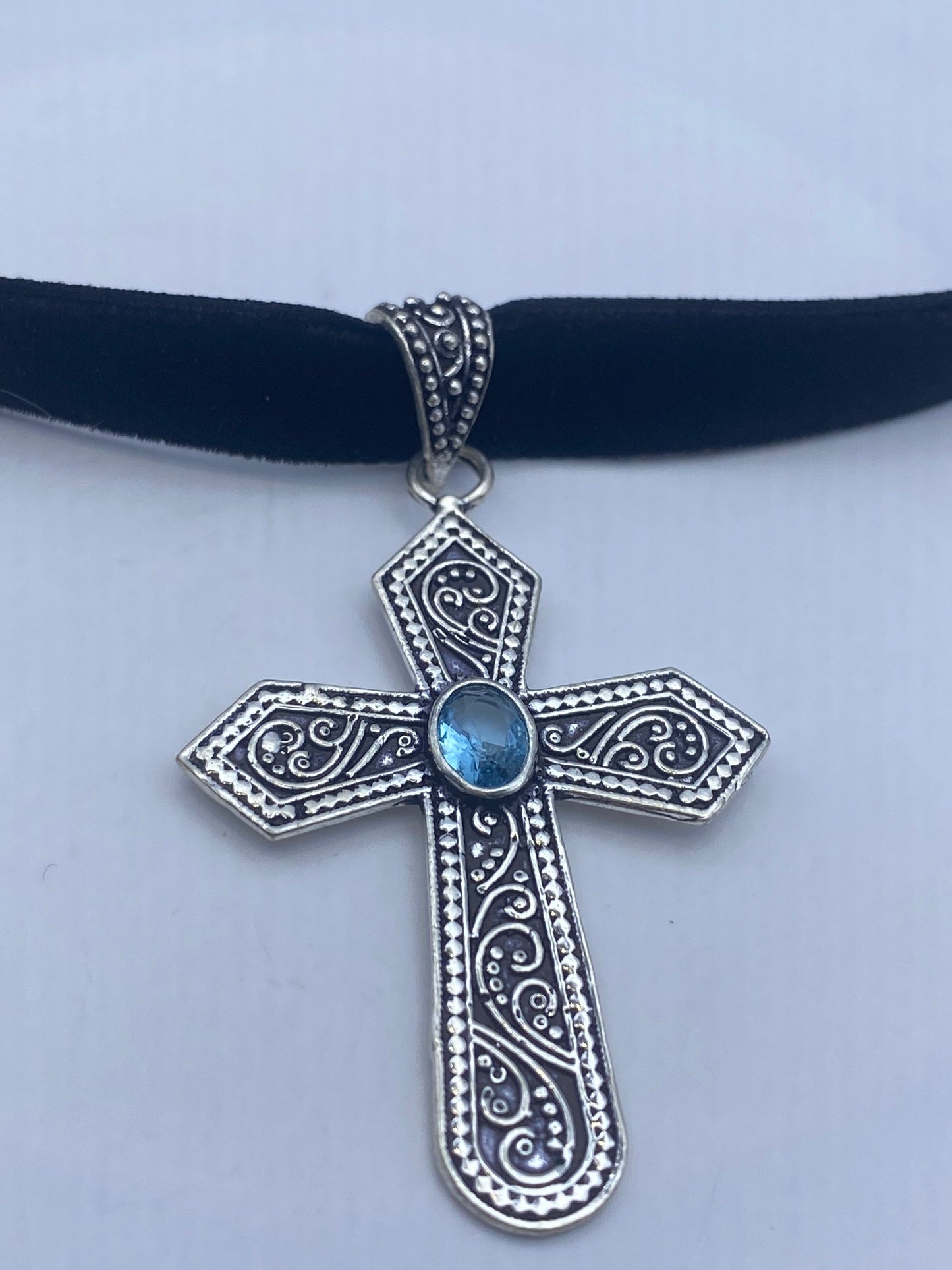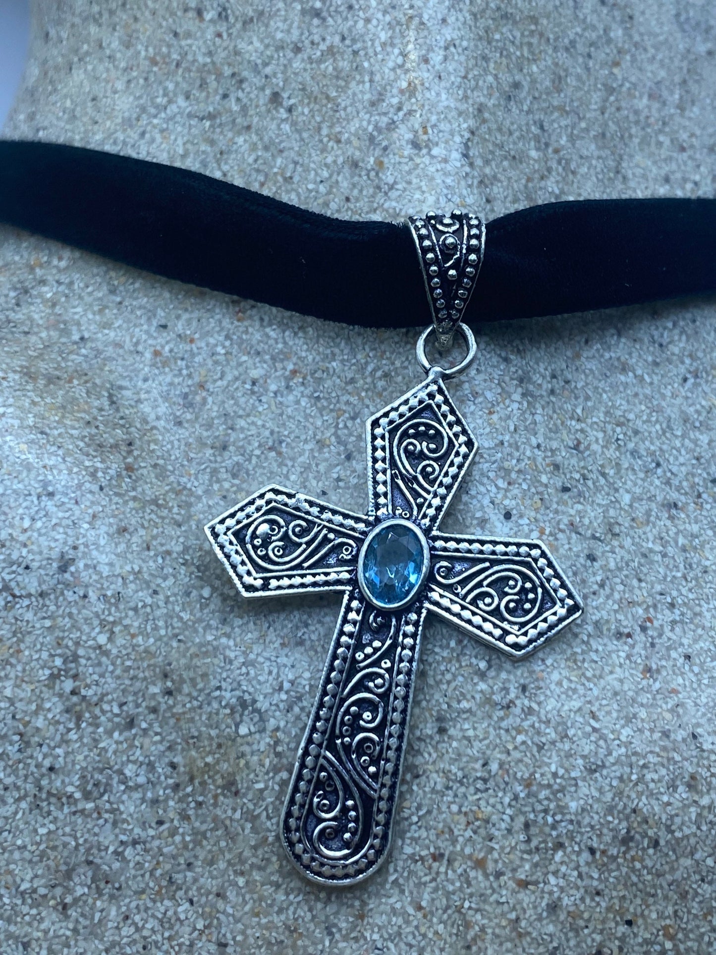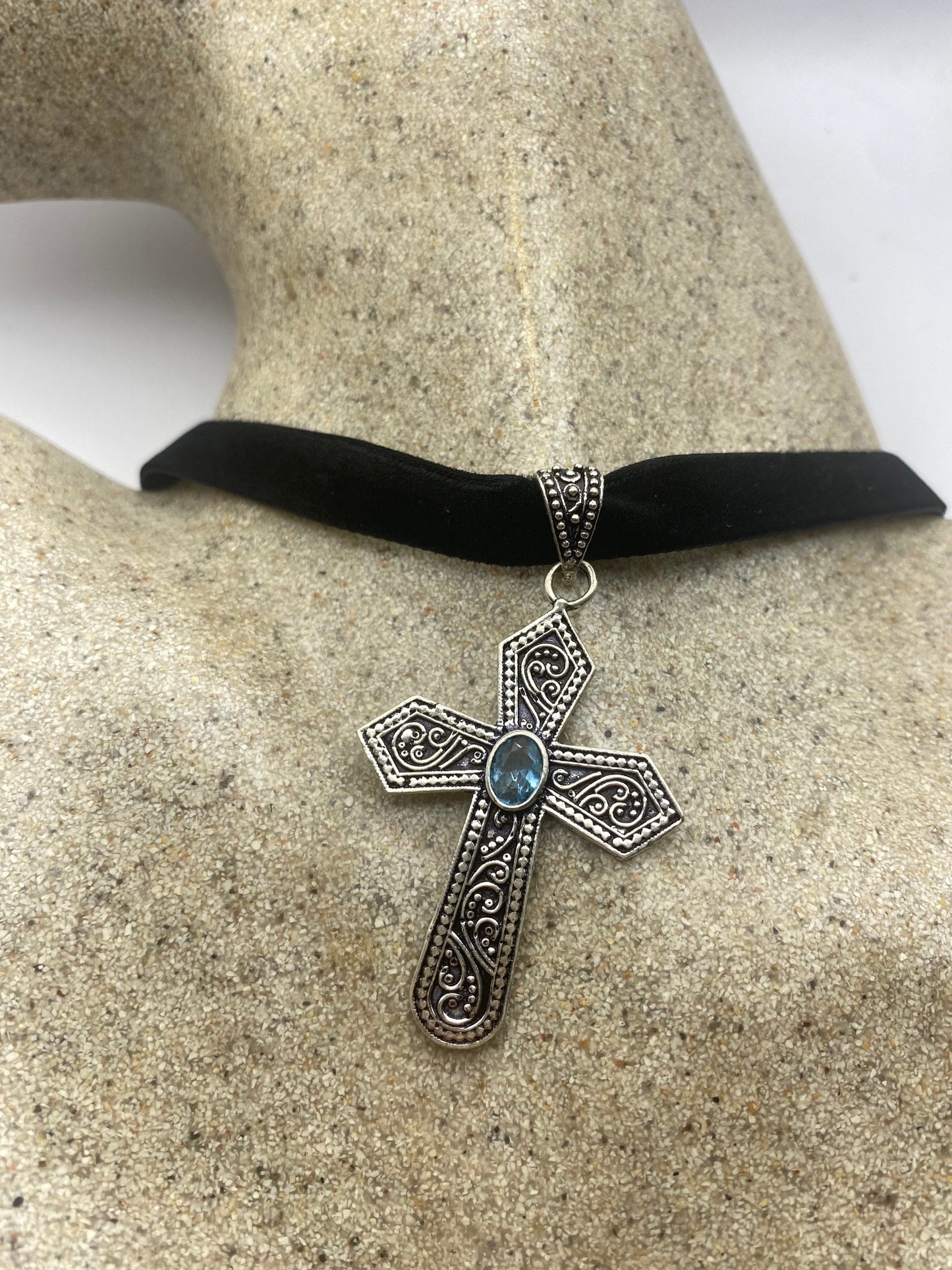 Vintage blue topaz bronze silver cross choker pendant