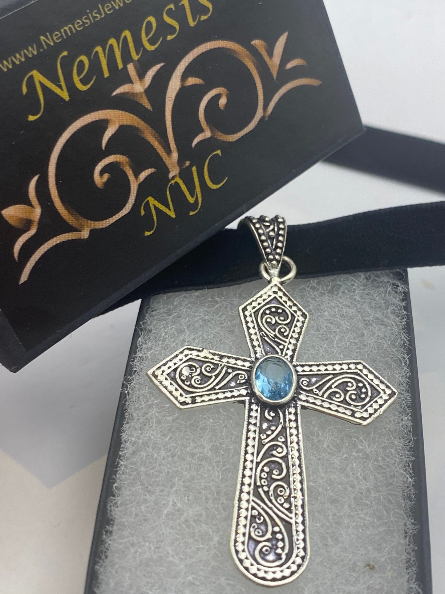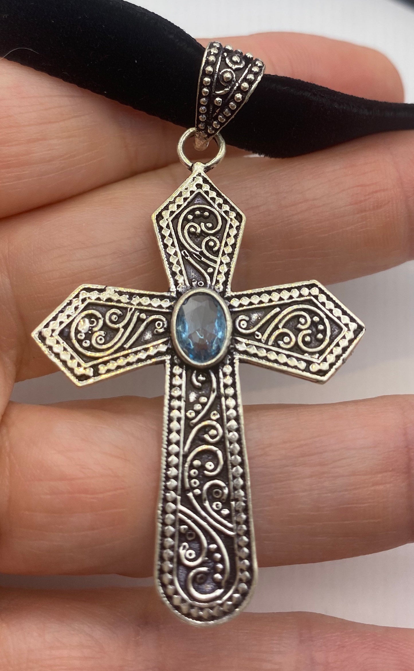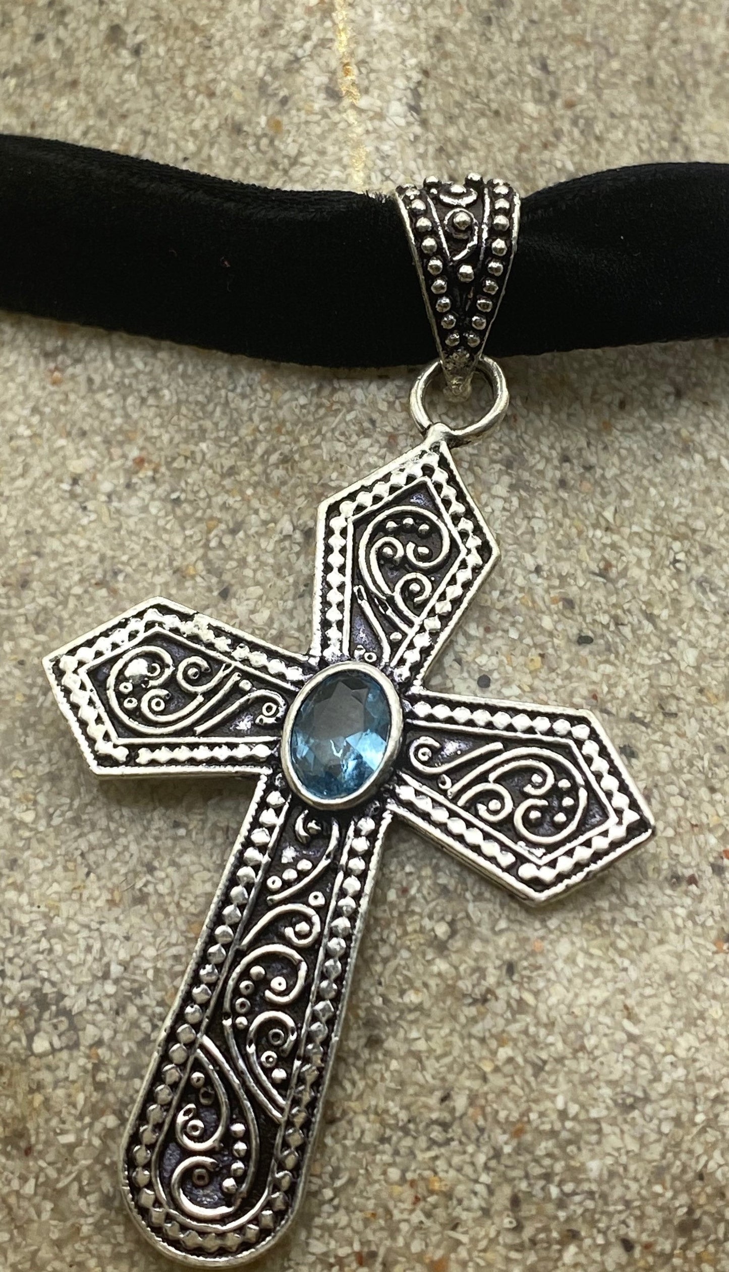 Vintage blue topaz bronze silver cross choker pendant