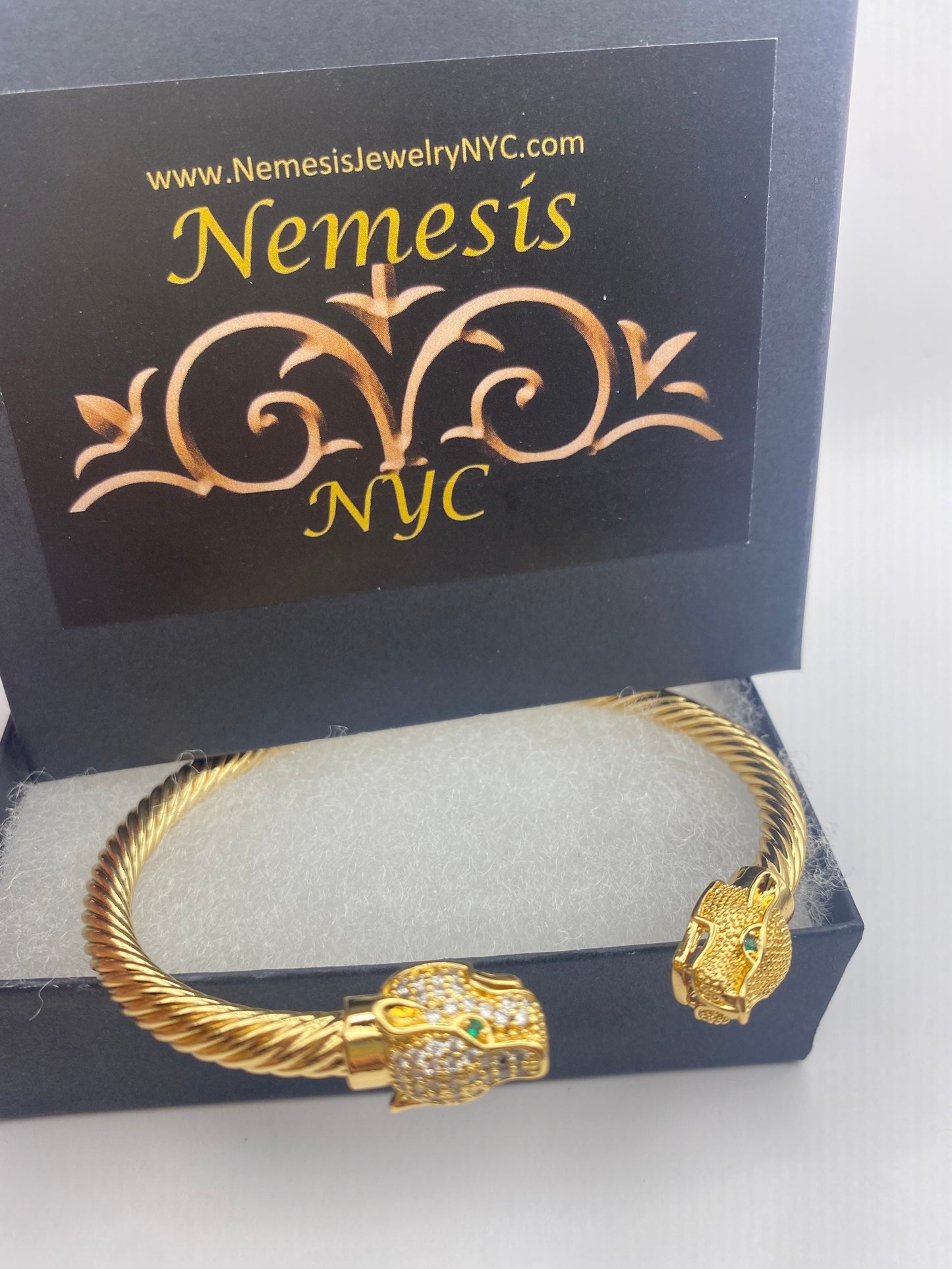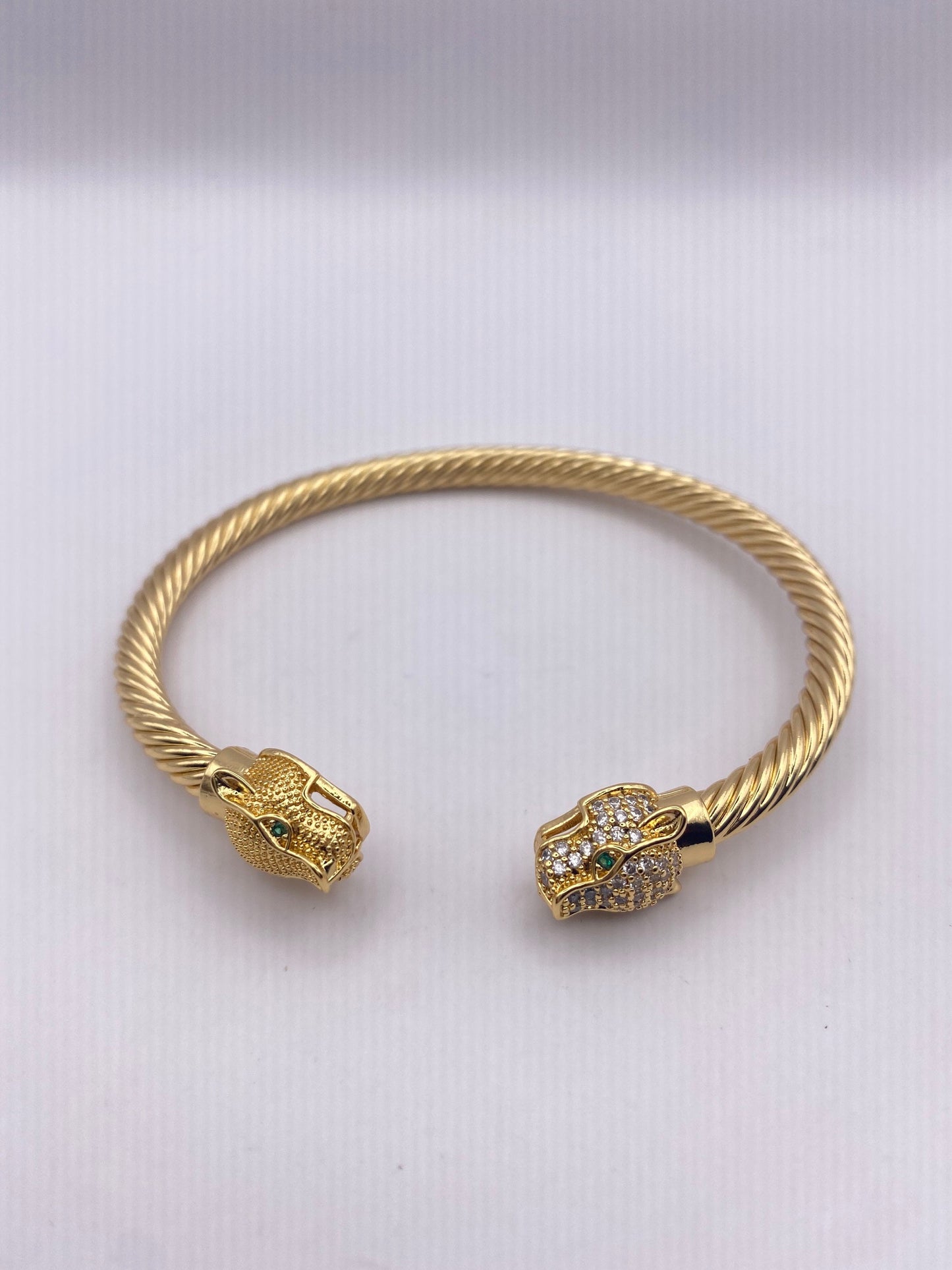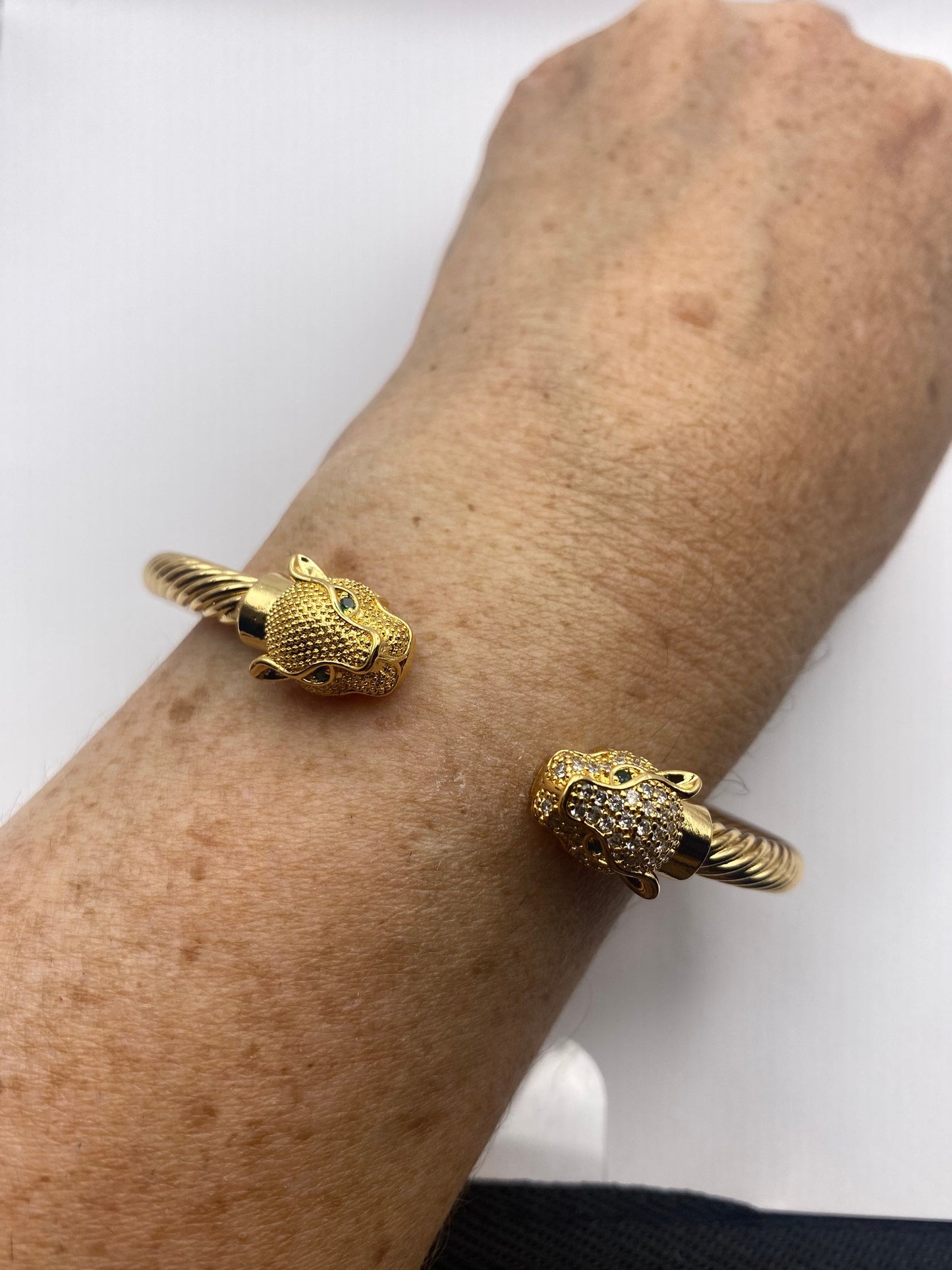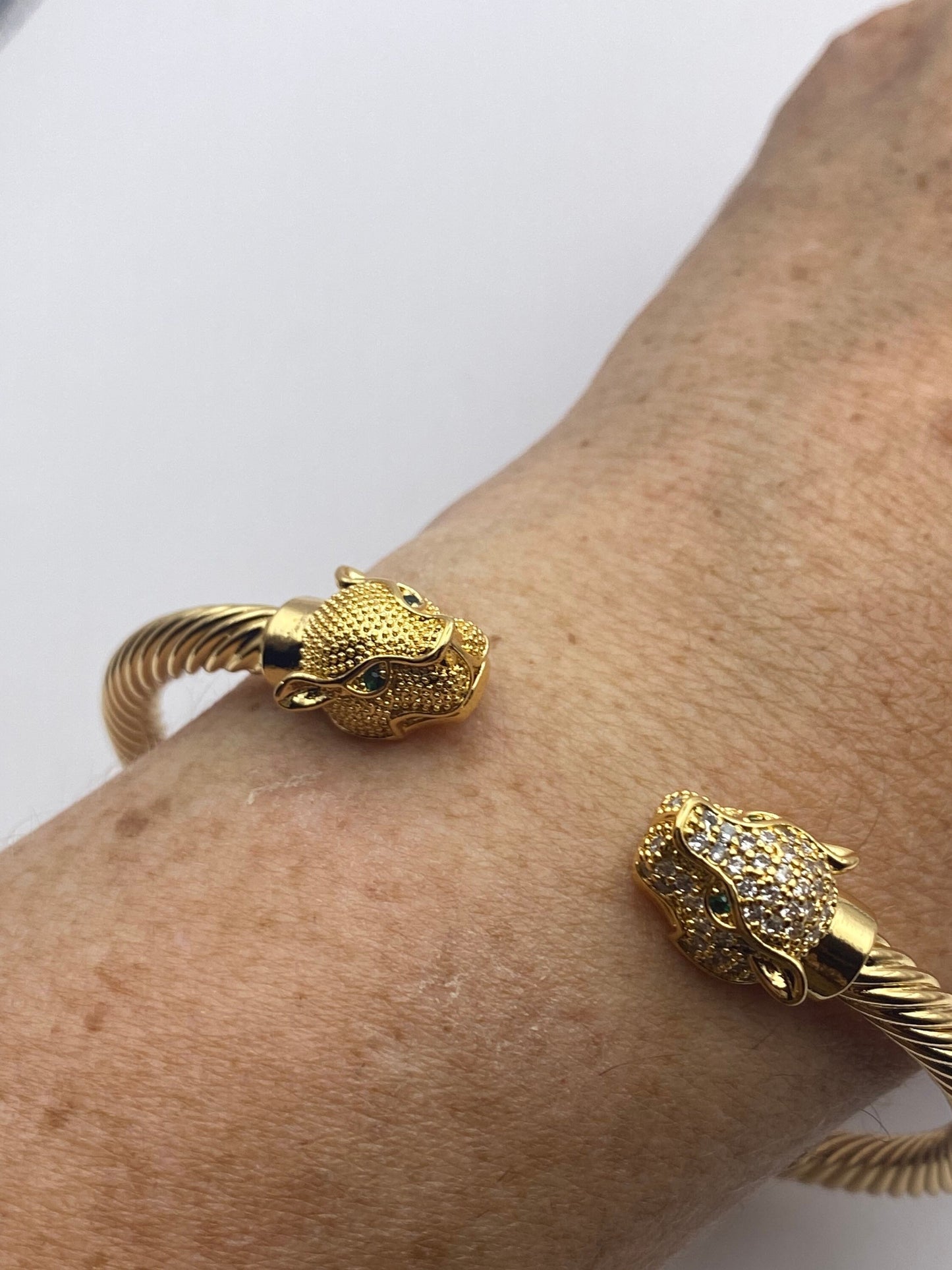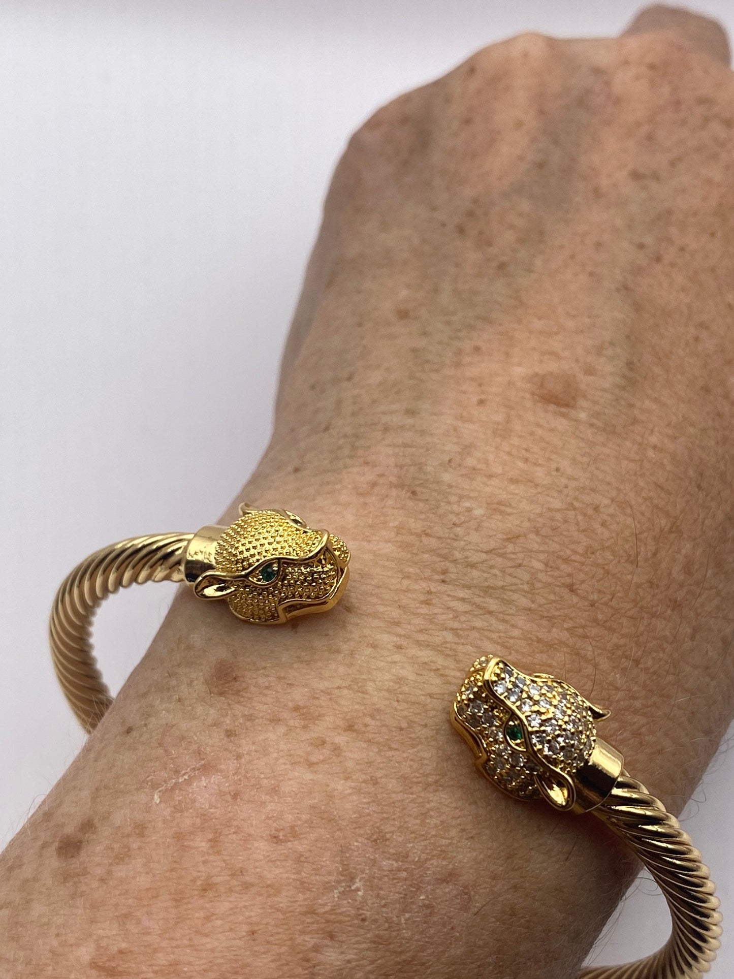 Vintage Cougar Cat Bangle Bracelet Gold filled Green Crystal Eyes